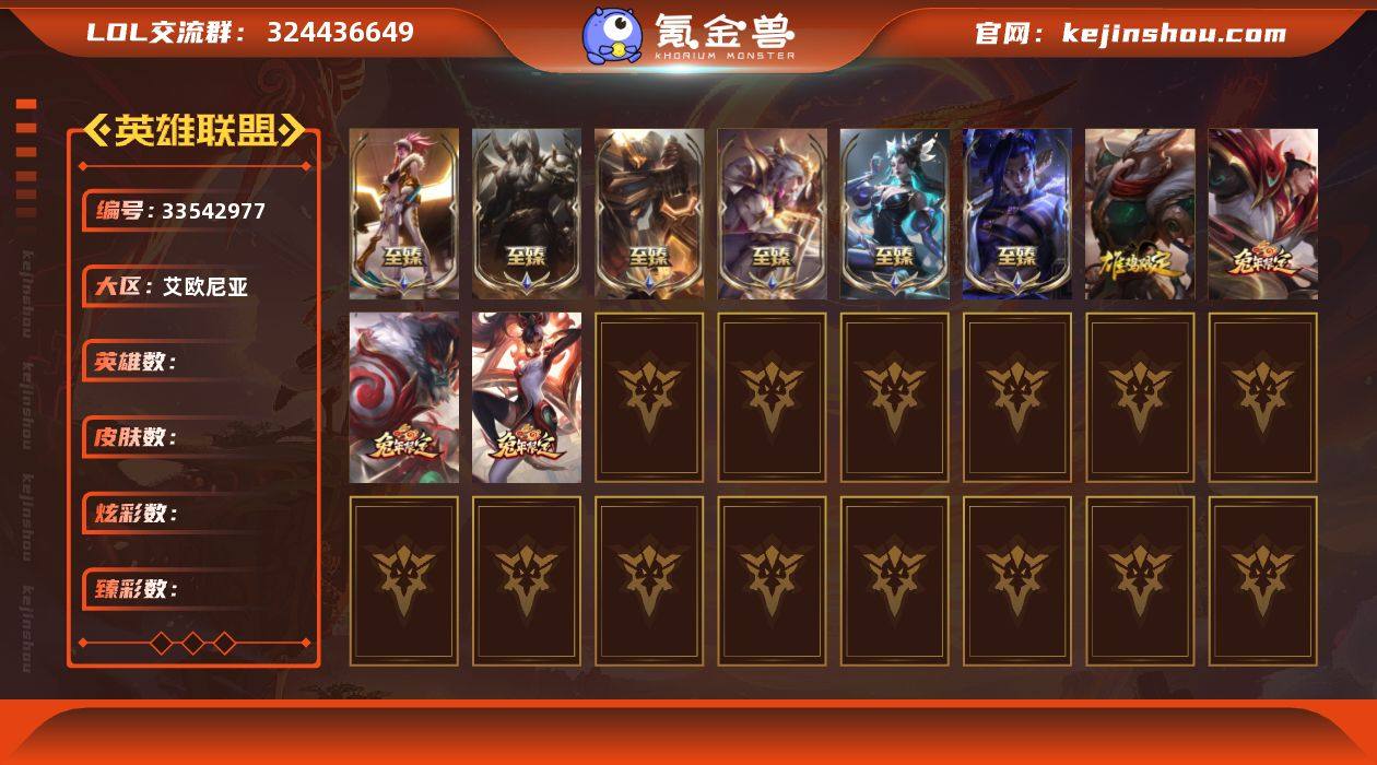 [18831753]1终极 19神话 51限定 53传说 43史诗 356皮肤 228炫彩 172英雄 可二次 可修改实名
