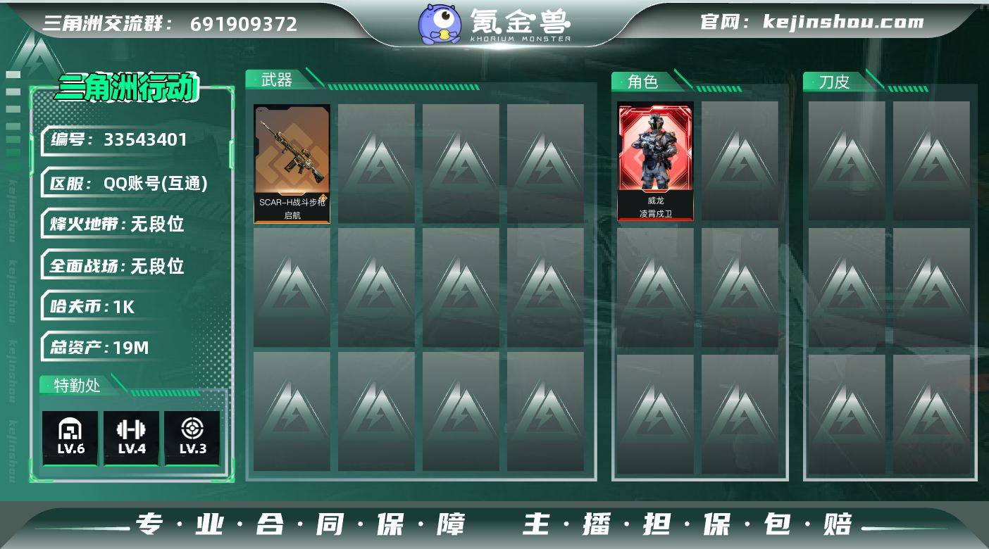 【937824】[17739590]实名: 可修改 烽火地带段位: 无段位 全面战场段位: 无段位 总资产: 19 哈夫币: 1 干员外观: 威龙-凌霄戍卫 传说武器皮肤: SCAR-H战斗步枪-启航,QBZ95-1突击步枪-凌霄戍卫,K416突击步枪-行动记录,勇士冲锋枪-万金泪冠,腾龙突击步枪-万金泪冠,AWM狙击步枪-万金泪冠
