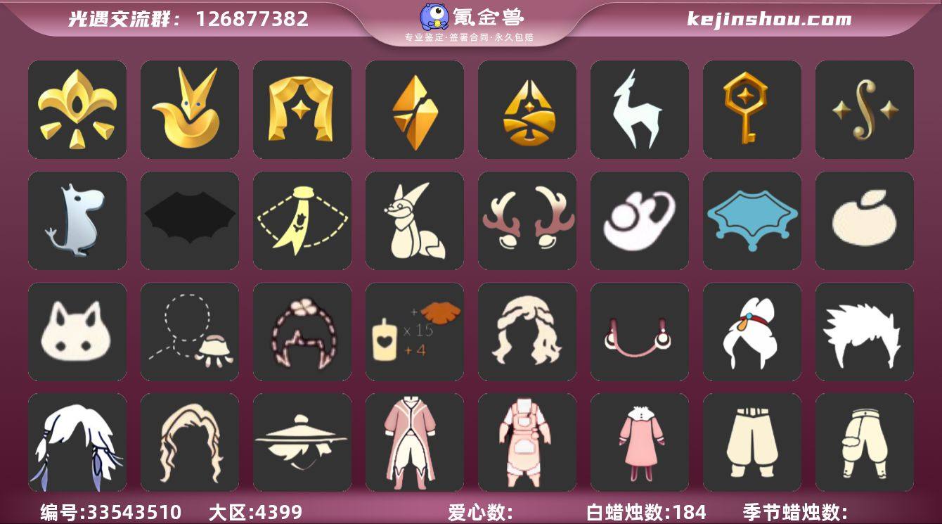 [18832171]VIVO 手机账号 3珍稀物品 9毕业季 6毕业图 184蜡烛 【珍稀物品】白枭(帝企鹅发),玫瑰花,彩虹围巾(五塑彩带斗) 【季节已毕业】集结季,小王子季(王子季),表演季,破晓季,归巢季,九色鹿(九色鹿季),筑巢季,二重奏季,姆明季 【完成地图】晨岛,云野,雨林,霞谷,墓土(暮土),禁阁 【礼包】兔子鞋(兔子拖鞋),水母(水母肩饰),海蓝波浪发型(海洋发型),橘子(大橘大利),兔子(玉兔头饰)(玉兔发饰)(兔子发饰),四叶草(四叶草头饰),满月耳坠,鹿角(圣诞鹿角),创始人(创始人斗篷),围巾(小王子斗篷)(小王子围巾),莲花斗(异彩莲花斗篷),线框斗篷礼包(周年线框斗篷),蝙蝠套(蝙蝠斗篷)(南瓜头),瑞雪(瑞雪斗篷)(暖冬瑞雪),小狐狸(狐狸背包) 【裤子】筑巢季·裤子(设计师长袍),青鸟尊贵蓬头裤子(蓝色燕尾服),飞天裤(柔缎花边连)(九色鹿丝带裤),妮妮裙子(妮妮长裙),王子服(小王子套装),武士裤,背带裤,搓澡巾 【面具】黄眉企鹅面具,夜行毕业面具(棕熊面具),贴花面具(丛林黑面具) 【面饰】红耳机 【发型】小王子发型,海蓝波浪发型,飞天盘发(九色鹿丸子头),虚荣,归巢毕业发型(五塑彩羽发),若笠(箬笠) 【头饰】平顶帽,蓝色音乐会(蓝色音乐符),行军锅头盔(六边锅帽子)(双耳锅帽子) 【斗篷】冥龙斗篷,...
