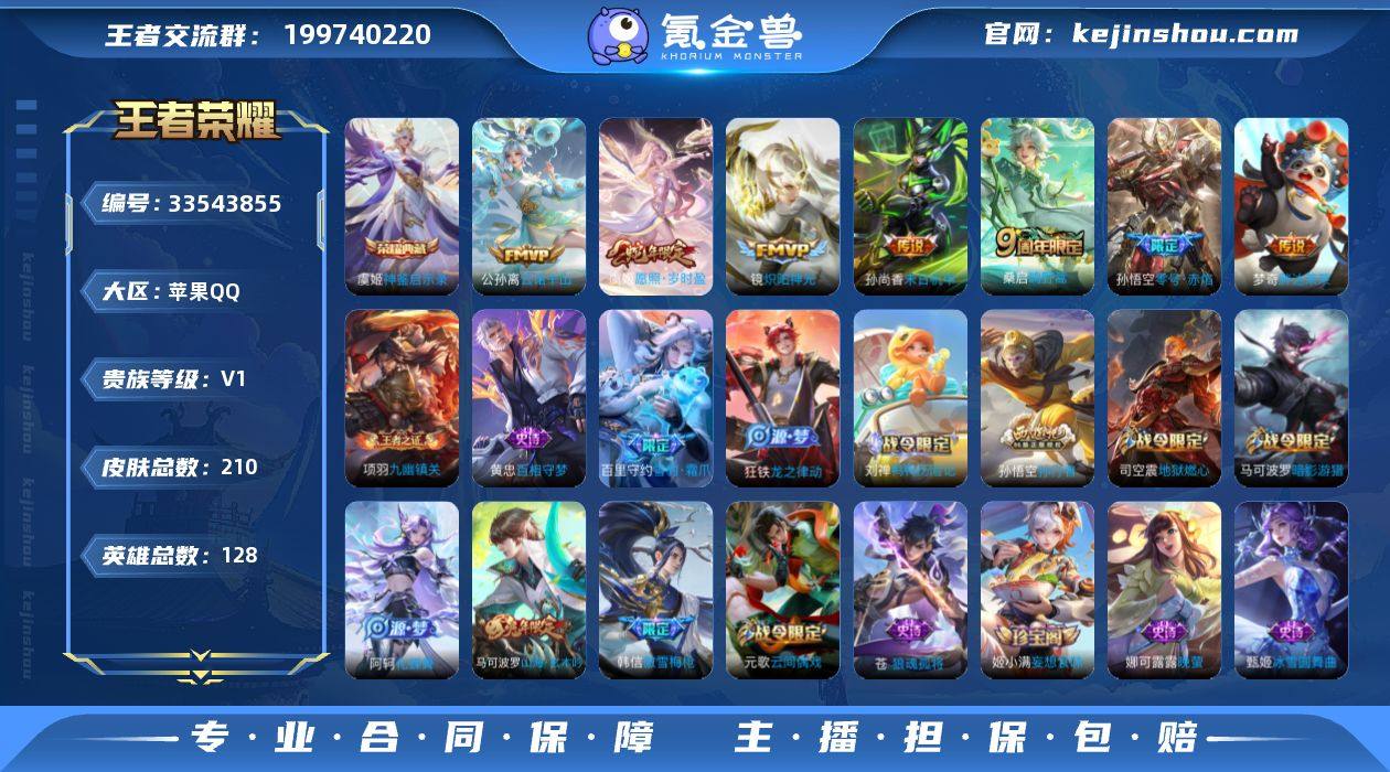 苹果Q-V0-尊贵铂金II段位-128英雄-210皮肤-1典藏皮肤-7传说-57史诗 【英雄全皮】:苍全皮,空空儿全皮 【荣耀典藏】:虞姬神鉴启示录 【传说皮肤】:公孙离云诺千山,虞姬愿照岁时盈,桑启鸣野蒿,镜炽阳神光,孙悟空零号赤焰,梦奇胖达荣荣,孙尚香末日机甲 【限定皮肤】:姜子牙天穹之誓,杨戬破阵退雄兵,狄仁杰阴阳师,赵云皇家上将,高渐离死亡摇滚,高渐离玩趣恶龙,元歌云间偶戏,元歌无心,马可波罗暗影游猎,马可波罗山海玄木吟,狄仁杰魔术师,狄仁杰万华元夜,达摩沙漠行僧,项羽海滩派对,老夫子醍醐杖,程咬金演武夺筹,韩信傲雪梅枪,亚瑟潮玩骑士王,孙悟空零号赤焰,孙悟空孙行者,后羿如梦令,李元芳云中旅人,钟馗驱傩正仪,雅典娜黎明之约,鬼谷子原初探秘者,鬼谷子五谷丰年,苏烈千军破阵,百里玄策原初追逐者,梦奇顽趣,沈梦溪星空之诺,沈梦溪大漠名商,裴擒虎李小龙,裴擒虎擒涛扼浪,云中君纤云弄巧,上官婉儿梁祝,蒙犽狂想玩偶喵,鲁班大师探海日志,桑启海盐诗旅,艾琳流音漫舞,司空震地狱燃心,阿古朵江河有灵,张良古海寻踪,蒙恬荣光圣徽,鬼谷子天穹祈灯,伽罗琥珀纪元,姬小满妄想食味,沈梦溪龙舞盛年,刘邦剑破天穹,周瑜熔金海岸 【年...