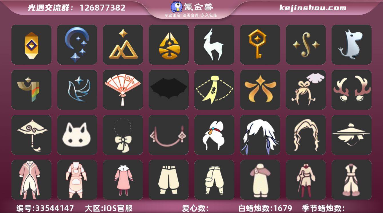 [18832863]iOS官服 邮箱账号 1珍稀物品 10毕业季 6毕业图 1679蜡烛 【珍稀物品】彩虹围巾(五塑彩带斗) 【季节已毕业】追忆季,夜行季,拾光季,归巢季,九色鹿(九色鹿季),筑巢季,二重奏季,姆明季,彩染季,青鸟季 【完成地图】晨岛,云野,雨林,霞谷,墓土(暮土),禁阁 【礼包】蝴蝶结(大蝴蝶结),绊爱(绊爱斗篷)(绊爱礼包),兔子(玉兔头饰)(玉兔发饰)(兔子发饰),新年耳钉(金鳞耳饰),鹿角(圣诞鹿角),围巾(小王子斗篷)(小王子围巾),欧若拉之翼,蝙蝠套(蝙蝠斗篷)(南瓜头),红伞(瑞气纸伞),献瑞折扇礼包 【裤子】筑巢季·裤子(设计师长袍),青鸟尊贵蓬头裤子(蓝色燕尾服),飞天裤(柔缎花边连)(九色鹿丝带裤),妮妮裙子(妮妮长裙),武士裤,背带裤,搓澡巾,击剑裤 【面具】夜行毕业面具(棕熊面具),辉光羚羊面具 【面饰】黑框眼镜(粗框眼镜),青鸟毕业面饰(青鸟面饰),红耳机 【项链】围巾(肩带) 【发型】飞天盘发(九色鹿丸子头),虚荣,归巢毕业发型(五塑彩羽发),若笠(箬笠) 【头饰】平顶帽,蓝色音乐会(蓝色音乐符),牛仔帽(西部帽) 【斗篷】粉红绒毛斗篷(绒毛斗篷),青鸟毕业斗篷(青鸟斗篷),彩染围巾斗篷,绿芽 【配饰】鲲灯(追忆之书),相机(季卡相机),小红伞(姆明红伞)(姆明大伞),姆明抱枕,二重奏挂画(合奏...