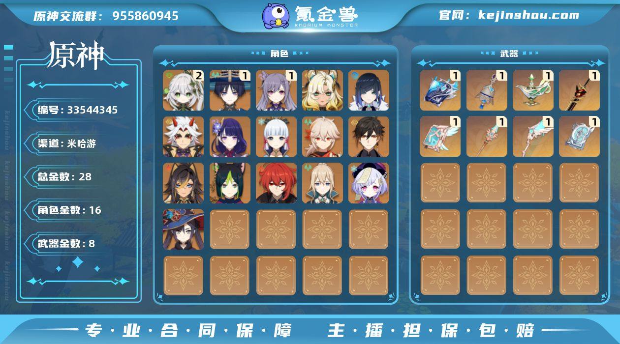 58级/28黄/女主/16个五星角色/8个五星武器 0命迪希雅,1命流浪者,2命纳西妲,0命提纳里,0命夜兰,0命荒泷一斗,0命雷电将军,0命枫原万叶,0命神里绫华,0命钟离,1命刻晴,0命七七,0命琴,0命莫娜,0命迪卢克,0命希诺宁,精1万世流涌大典,精1图莱杜拉的回忆,精1千夜浮梦,精1赤角石溃杵,精1四风原典,精1天空之脊,精1天空之翼,精1天空之卷