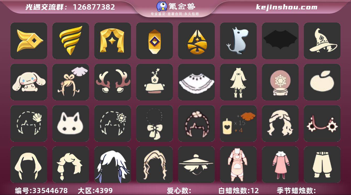 [18833541]安卓官服 手机账号 2珍稀物品 8毕业季 4毕业图 12蜡烛 【珍稀物品】白枭(帝企鹅发),彩虹围巾(五塑彩带斗) 【季节已毕业】风行季,潜海季,表演季,追忆季,归巢季,姆明季,双星季,迁徙季 【完成地图】晨岛,雨林,霞谷,墓土(暮土) 【礼包】女巫裙,蝴蝶结(大蝴蝶结),海蓝波浪发型(海洋发型),巫师(巫师帽),绊爱(绊爱斗篷)(绊爱礼包),橘子(大橘大利),雪花(雪花发夹),贝壳(贝壳发饰),兔子(玉兔头饰)(玉兔发饰)(兔子发饰),四叶草(四叶草头饰),日光耳环,鹿角(圣诞鹿角),创始人(创始人斗篷),蝙蝠套(蝙蝠斗篷)(南瓜头),白绒金(白雪斗篷),茶桌(花憩茶桌),南瓜(冥龙南瓜),雪花球(雪花水晶球),大耳狗抱枕 【裤子】筑巢季·裤子(设计师长袍),妮妮裙子(妮妮长裙),蓝绿裤(高领舞服),武士裤,背带裤,搓澡巾 【面具】黄眉企鹅面具,夜行毕业面具(棕熊面具),呼吸面具(潜水面具) 【面饰】黑框眼镜(粗框眼镜),红耳机 【项链】围巾(肩带) 【发型】单侧绑发(单边小辫),留辫蘑菇头,海蓝波浪发型,虚荣,归巢毕业发型(五塑彩羽发),若笠(箬笠) 【头饰】平顶帽,蓝色音乐会(蓝色音乐符),羽毛发饰(多羽发饰) 【斗篷】燕尾斗篷,绿芽 【配饰】鲲灯(追忆之书),相机(季卡相机),小红伞(姆明红伞)(姆明大伞),姆明...