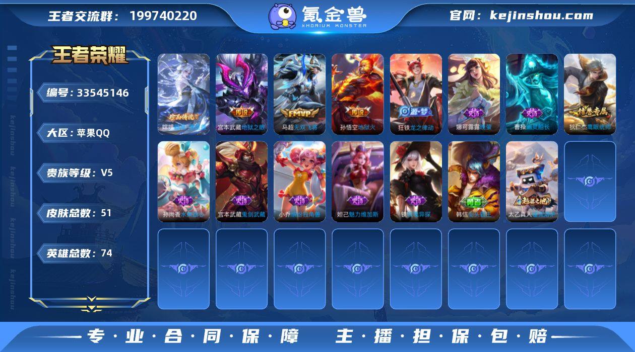 【史诗皮肤】:周瑜线条小狗,狂铁龙之律动,镜玫瑰异探,娜可露露晚萤,狄仁杰鹰眼统帅,小乔缤纷独角兽,曹操幽灵船长,妲己魅力维加斯,孙尚香水果甜心,孙尚【商品标题】:苹果Q-Vundefined-永恒钻石IV-74英雄-51皮肤-0典藏-0无双-1珍品传说-5传说-12史诗
