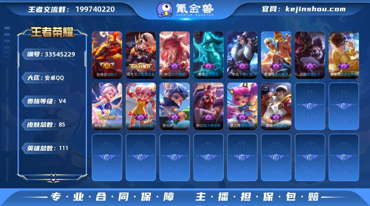 V4 2传说 111英雄 85皮肤 可二次 可修改实名 男号