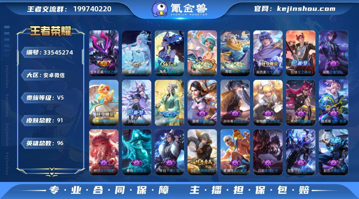 实名: 可修改 性别: 女号 贵族等级: V5 英雄数: 96 皮肤数: 91 传说皮: 地狱之眼,霜月吟 亮点: 【优质装备】:地狱之眼,霜月吟