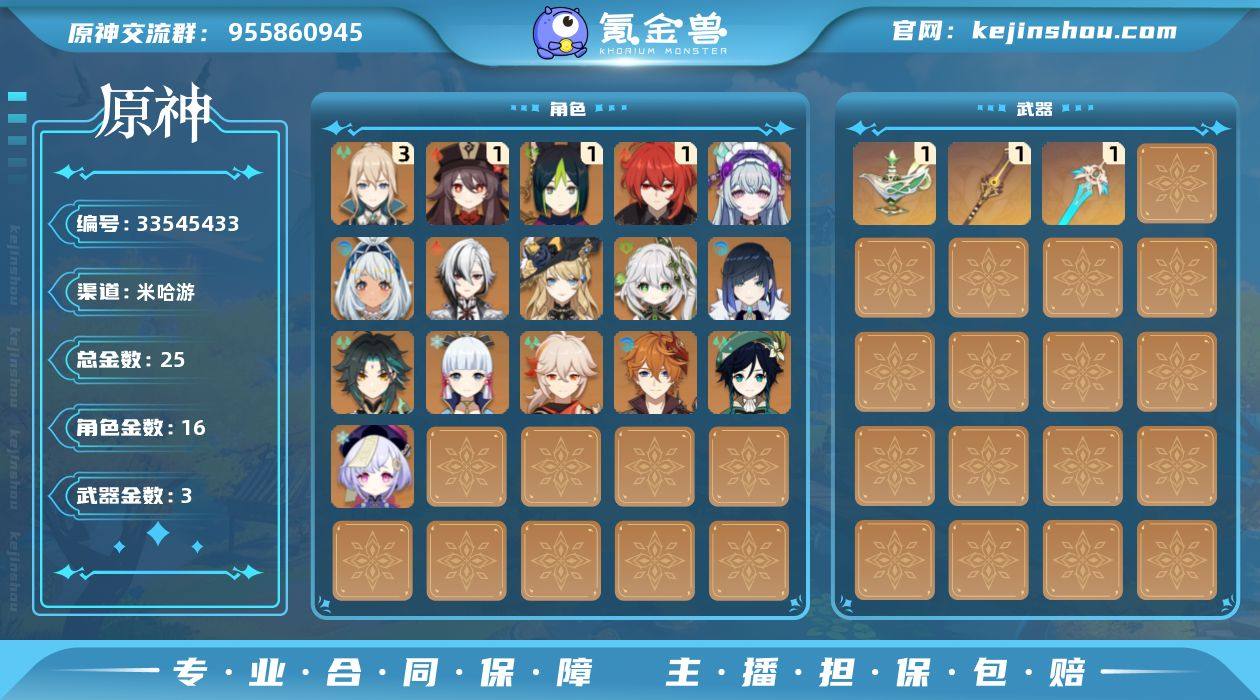 57级/25黄/女主/16个五星角色/3个五星武器 0命阿蕾奇诺,0命娜维娅,0命纳西妲,1命提纳里,0命夜兰,0命枫原万叶,0命神里绫华,1命胡桃,0命魈,0命温迪,0命达达利亚,0命七七,3命琴,1命迪卢克,0命玛拉妮,0命梦见月瑞希,精1千夜浮梦,精1赤沙之杖,精1天空之刃