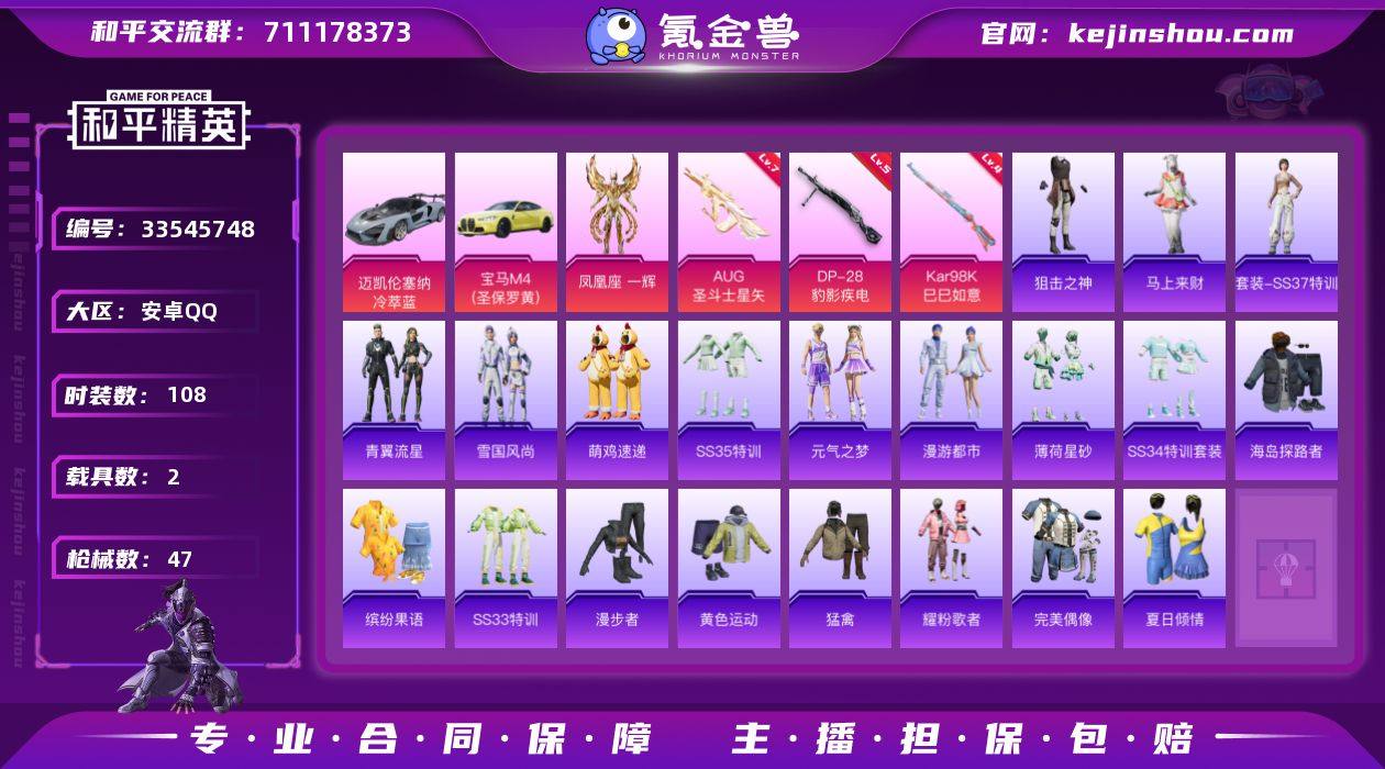 有事要卖。载具2个,粉装1个,粉枪3个(AUG全满),飞行器3个,粉降落伞 3个,套装23个,抢皮47个,头盔背包皮全稀有