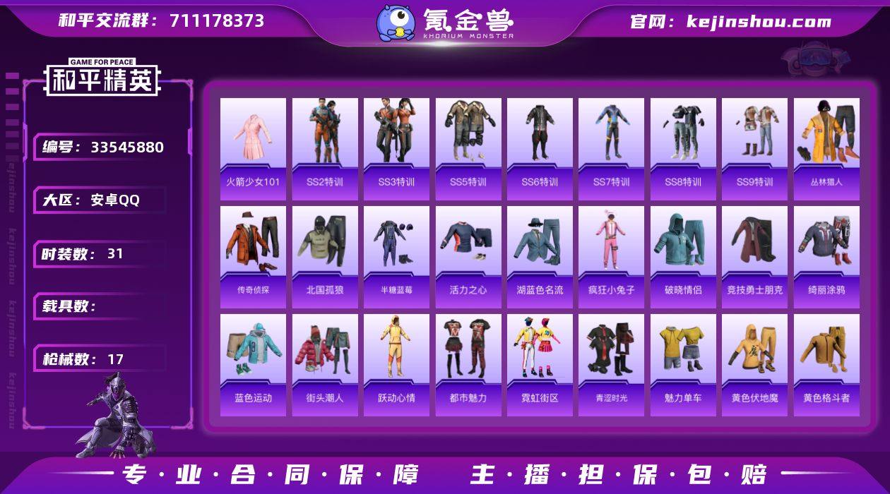 【老101老火箭少女101】安卓 手Q-0粉装-0特效枪-0载具-0粉色飞行器-5436热力值-1王牌印记-31套装-17枪皮 【热门品类】:套装-火箭少女101 【稀有枪皮】:SCAR-L-生命誓言,M416-蓝色火焰,GROZA-春暖花开,UZI-生命誓言,UMP45-生命誓言,Kar98K-红色方程式,Mini14-梦幻火箭,M249-工程核心 【其他套装】:套装-SS2特训,套装-SS3特训,套装-SS5特训,套装-SS6特训,套装-SS7特训,套装-SS8特训,套装-SS9特训,套装-丛林猎人,套装-传奇侦探,套装-北国孤狼,套装-半糖蓝莓,套装-活力之心,套装-湖蓝色名流,套装-疯狂小兔子,套装-破晓情侣,套装-竞技勇士朋克,套装-绮丽涂鸦,套装-蓝色运动,套装-街头潮人,套装-跃动心情,套装-都市魅力,套装-霓虹街区,套装-青涩时光,套装-魅力单车,套装-黄色伏地魔,套装-黄色格斗者,套装-战地菁英,套装-夜莺强袭者,套装-雪山精英,套装-圣诞大吉 【营地ID】:1038970354