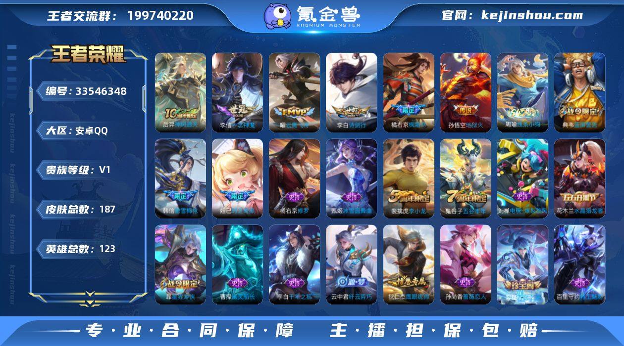 【打野号!!橘右京枫霜尽 李白诗剑行 曜云鹰飞将 地狱火】安卓Q-V0-永恒钻石III段位-122英雄-187皮肤-6传说-36史诗 【英雄全皮】:橘右京全皮,敖隐全皮 【传说皮肤】:后羿神树通天,李白诗剑行,橘右京枫霜尽,曜云鹰飞将,李信一念神魔,孙悟空地狱火 【限定皮肤】:狄仁杰阴阳师,赵云皇家上将,妲己时之奇旅,孙尚香蔷薇恋人,钟无艳超时空战士,扁鹊奇幻香踪,夏侯惇朔风刀,甄姬落雪兰心,曹操烛龙,典韦穷奇,典韦蓝屏警告,狄仁杰魔术师,狄仁杰万华元夜,达摩沙漠行僧,项羽海滩派对,老夫子醍醐杖,程咬金演武夺筹,韩信傲雪梅枪,兰陵王金庭之子,橘右京枫霜尽,牛魔御旌,李元芳银河之约,李元芳云中旅人,钟馗驱傩正仪,杨戬潮玩骑兵,女娲朔望之晖,干将莫邪胡桃夹子,雅典娜黎明之约,鬼谷子原初探秘者,鬼谷子五谷丰年,弈星混沌棋,沈梦溪星空之诺,沈梦溪大漠名商,明世隐疑决卦,裴擒虎李小龙,裴擒虎擒涛扼浪,狂铁御狮,米莱狄御霄,云中君纤云弄巧,盾山御銮,嫦娥暖冬兔眠,鲁班大师探海日志,桑启海盐诗旅,暃星界游侠,张良古海寻踪,蒙犽百解令,蒙恬荣光圣徽,鬼谷子天穹祈灯,刘邦剑破天穹,周瑜熔金海岸 【赛季限定】:曹操烛龙,典韦穷奇,狂...