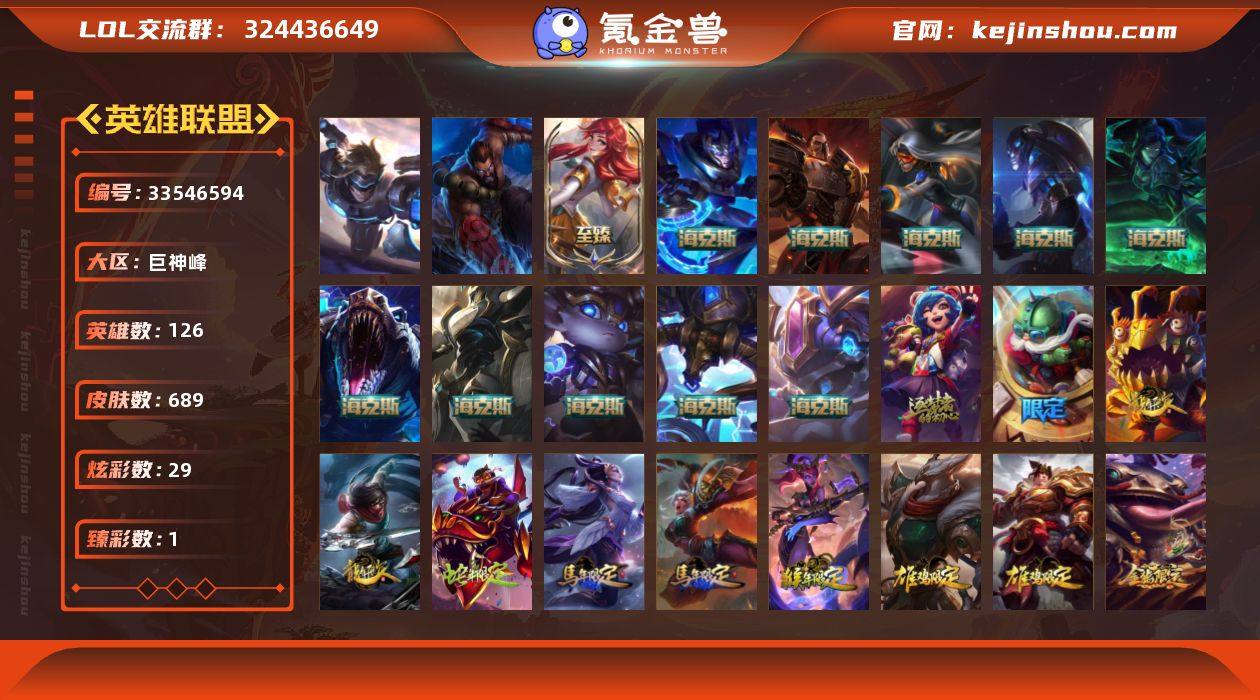 未定级段位-126英雄-689皮肤-29炫彩-2终极-12神话-108限定-59传说-196史诗 【热门头像】:爱情之歌头像,战斗学院拉克丝头像 【至臻皮肤】:至臻战斗学院拉克丝 【臻彩皮肤】:征服者韦鲁斯炫金 【年限皮肤】:银龙裁决泰隆,醒狮克格莫,神龙之翼库奇,广寒仙子嫦娥,替父从军花木兰,玉净夜叉凯特琳,碧玉之牙卡西奥佩娅,司马懿仲达,张辽文远,纳财大帝塔姆 【海克斯皮肤】:海克斯科技雷克顿,新创战纪希维尔,摄魂使者薇恩,零之枪骑赫卡里姆,恐惧新星德莱厄斯,海克斯科技玛尔扎哈,海克斯科技阿利斯塔,海克斯科技克格莫,海克斯科技嘉文四世,海克斯科技波比 【情人节限定】:觅心游侠卢锡安 【冰雪限定】:平安夜女神娑娜,冰雪风暴希维尔,圣诞老人布隆,魄罗骑士瑟庄妮,冰雪驯鹿波比,圣诞糖果棒厄运小姐,圣诞捣蛋鬼金克丝,冬季仙境卡尔玛 【终极皮肤】:灵魂守卫乌迪尔,未来战士伊泽瑞尔 【神话皮肤】:十周年纪念安妮,海克斯科技阿利斯塔,海克斯科技波比,海克斯科技嘉文四世,海克斯科技克格莫,海克斯科技雷克顿,海克斯科技玛尔扎哈,恐惧新星德莱厄斯,零之枪骑赫卡里姆,摄魂使者薇恩,新创战纪希维尔,至臻战斗学院拉克丝 【限定皮肤】:战熊骑士...