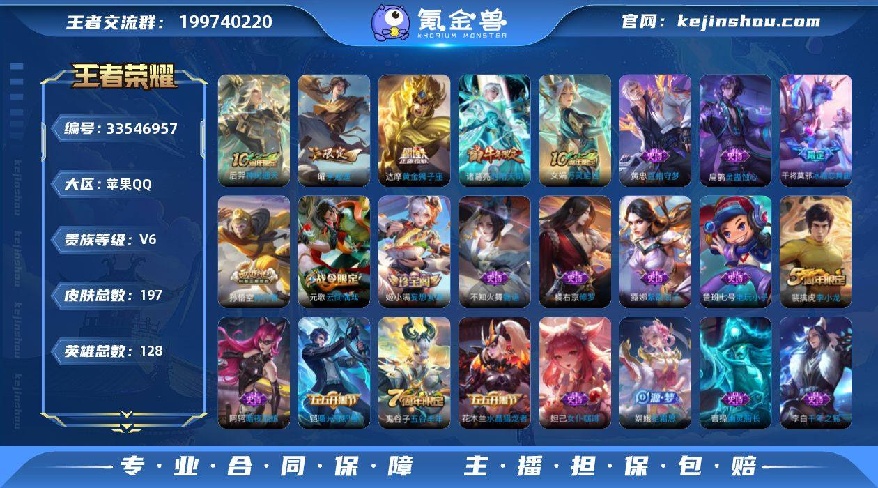 【c4380】苹果Q-V6-【特价出售,永久包赔】曜李逍遥!3424星币!荣耀水晶314幸运值!尊贵铂金IV段位-127英雄-197皮肤-4传说-56史诗 【传说皮肤】:后羿神树通天,曜李逍遥 ,诸葛亮时雨天司,达摩黄金狮子座 【限定皮肤】:狄仁杰阴阳师,赵云皇家上将,嬴政优雅恋人,孙尚香蔷薇恋人,庄周高山流水,高渐离死亡摇滚,元歌云间偶戏,夏侯惇朔风刀,甄姬游园惊梦,狄仁杰魔术师,狄仁杰万华元夜,达摩沙漠行僧,项羽海滩派对,老夫子醍醐杖,程咬金演武夺筹,兰陵王金庭之子,亚瑟潮玩骑士王,孙悟空孙行者,牛魔御旌,后羿圣弓游侠,李元芳云中旅人,钟馗驱傩正仪,杨玉环遇见飞天,干将莫邪冰霜恋舞曲,干将莫邪真爱魔法,雅典娜单词大作战,太乙真人华丽摇滚,鬼谷子原初探秘者,鬼谷子五谷丰年,诸葛亮时雨天司,苏烈千军破阵,百里玄策原初追逐者,弈星混沌棋,沈梦溪大漠名商,明世隐疑决卦,裴擒虎李小龙,裴擒虎擒涛扼浪,米莱狄御霄,云中君纤云弄巧,盾山御銮,上官婉儿梁祝,嫦娥拒霜思,曜李逍遥 ,蒙犽狂想玩偶喵,鲁班大师探海日志,桑启海盐诗旅,阿古朵江河有灵,张良古海寻踪,鬼谷子天穹祈灯,姬小满妄想食味,沈梦溪龙舞盛年 【年限皮肤】:诸葛亮时雨天司...