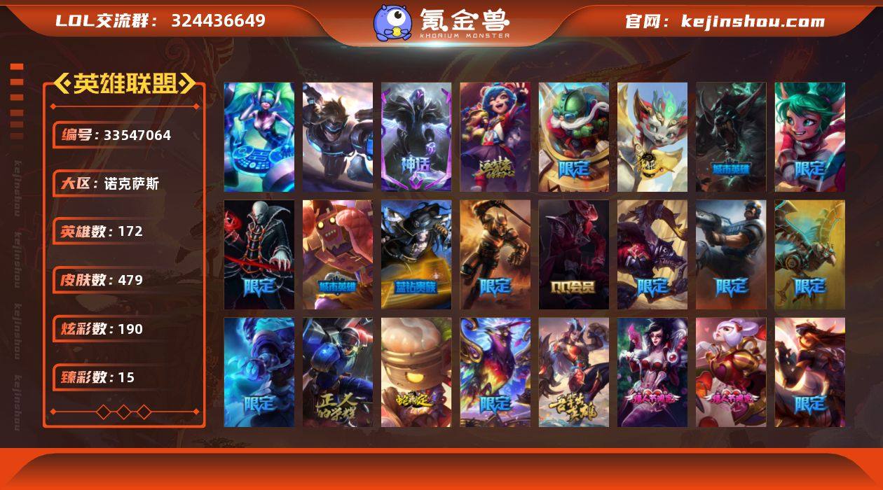 【皇冠号】未定级段位-172英雄-479皮肤-190炫彩-2终极-3神话-55限定-31传说-113史诗 【热门头像】:银河魔装机神安妮头像 【神话皮肤】:十周年纪念安妮,神凰行者瑞羽圣凰艾尼维亚,灰烬骑士派克 【臻彩皮肤】:天龙之子卡莎飞龙乘云,无畏骑士瑟庄妮赤子初心,墨之影武者亚索金墨耀影,冠军掠夺者卡兹克凯旋圣装,玉剑传说无极麒麟,女帝卡特琳娜纹章之刻印英勇,星之守护者金克丝黑洞,幻灵战斗狼塞拉斯梦幻强袭,源计划火菲奥娜惩戒,玉剑传说神机花火青竹,可爱可爱粉红红布里茨,海之歌艾希冰爽浪花,魔女阿卡丽虚荣,净雪之月莫甘娜冬虹 【年限皮肤】:天龙之子斯莫德,点心宝贝阿木木,龙马烈焰波比 【情人节限定】:觅心猎手薇恩,觅心魔灵奥莉安娜 【冰雪限定】:幸福女神乐芙兰,圣诞开心鬼提莫,圣诞精灵崔丝塔娜,圣诞狂欢努努和威朗普,圣诞糖果棒厄运小姐,阿木木“主人不要我了”,胡桃夹子萨科,平安夜女神娑娜,英勇玩具兵普朗克,喜庆之树茂凯,雪默丁格,圣诞玩偶波比,圣诞驯鹿克格莫,魄罗骑士瑟庄妮,冰雪节格雷福斯,冰雪女神辛德拉 【终极皮肤】:DJ娑娜,未来战士伊泽瑞尔 【限定皮肤】:庆典女皇艾尼维亚,诺斯费拉图弗拉基米尔,冠军典狱长锤石,暗...