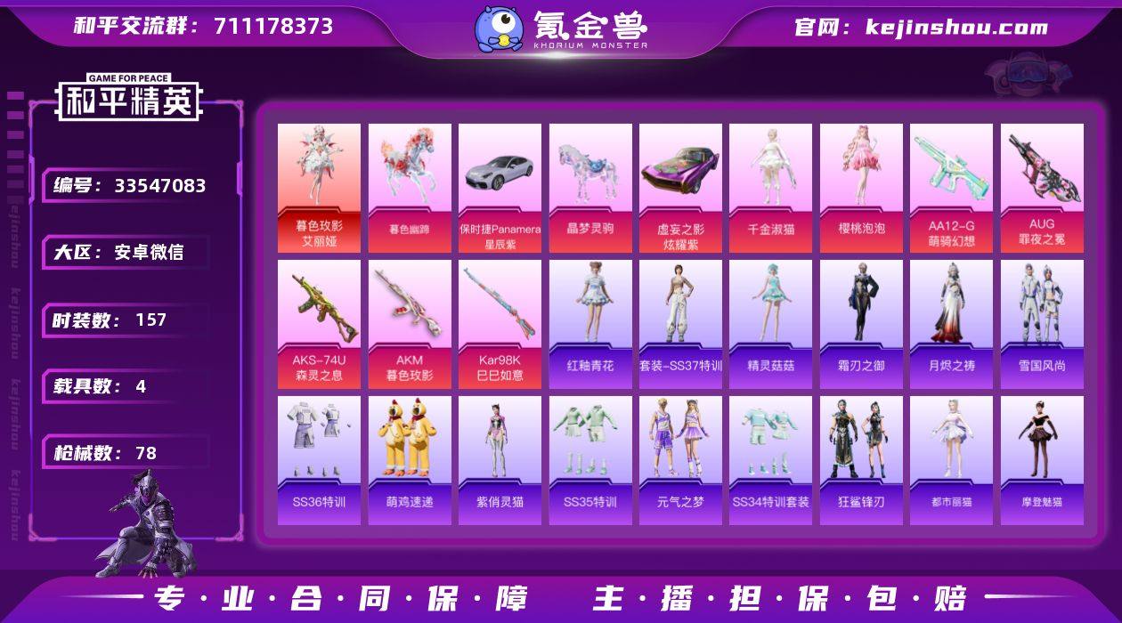 AL701569 【亏本清仓】 热力值29136 枪皮数量78 粉装数4 套装数量45 时装数157 载具数4 战备数49 【是本人】 【可排位】 【包人脸】 【是】 【支持】 【未绑定或可换绑】 【无换绑CD】 【是】 【是】 【是】 其他武器皮肤68 头盔48 动作13 伙伴2 其他武器皮肤:Mk47-洛神天依,M762-天降萌叽,AC-VAL-圣辉之星,AC-VAL-天降萌叽,蜜獾-虎痴许褚,蜜獾-乌木金纹,蜜獾-启元战纹,GROZA-暮色玫影,GROZA-紫矿核心,GROZA-晶梦幻蝶,GROZA-福马献瑞,AUG-异域银装,AUG-绝对恒星,AUG-冰晶雪宝,AKM-破晓战魂,QBZ-洛神天依,M16A4-雨过天青,M16A4-千金淑猫,SCAR-L-炫彩节奏,Famas-乌木金纹,ACE32-冰晶雪宝,Mini14-乌木金纹,Win94-晶梦幻蝶,M200-乌木金纹,M200-罪夜之冕,SVD-冷漠罗丽,AMR-雨过天青,AWM-暮色玫影,SKS-迅猛狂鲨,SKS-炫彩节奏,MK20-H-狂鲨锋刃,MK20-H-樱桃泡泡,SLR-霓彩脉冲,VSS-虎痴许褚,VSS-香桃花海,Mini14-香桃花海,汤姆逊-天降萌叽,汤姆逊-精灵菇菇,AKS-74U-乌木金纹,P90-巳巳如意,P90-紫矿核心,UMP45-生命誓言,UZI-炫彩糖果,SPAS-12-狂鲨锋刃,SPAS-12-罪夜之冕,S12K-极意拳锋,S12K-玩趣呆呆,AA12-G-雨过天青,S686-巳巳如意,...