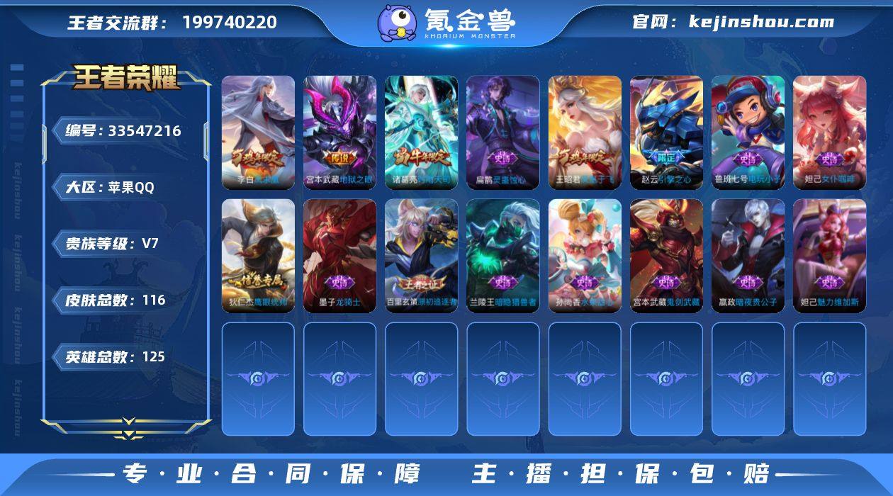 V7 3传说 125英雄 116皮肤 可二次 可修改实名 男号