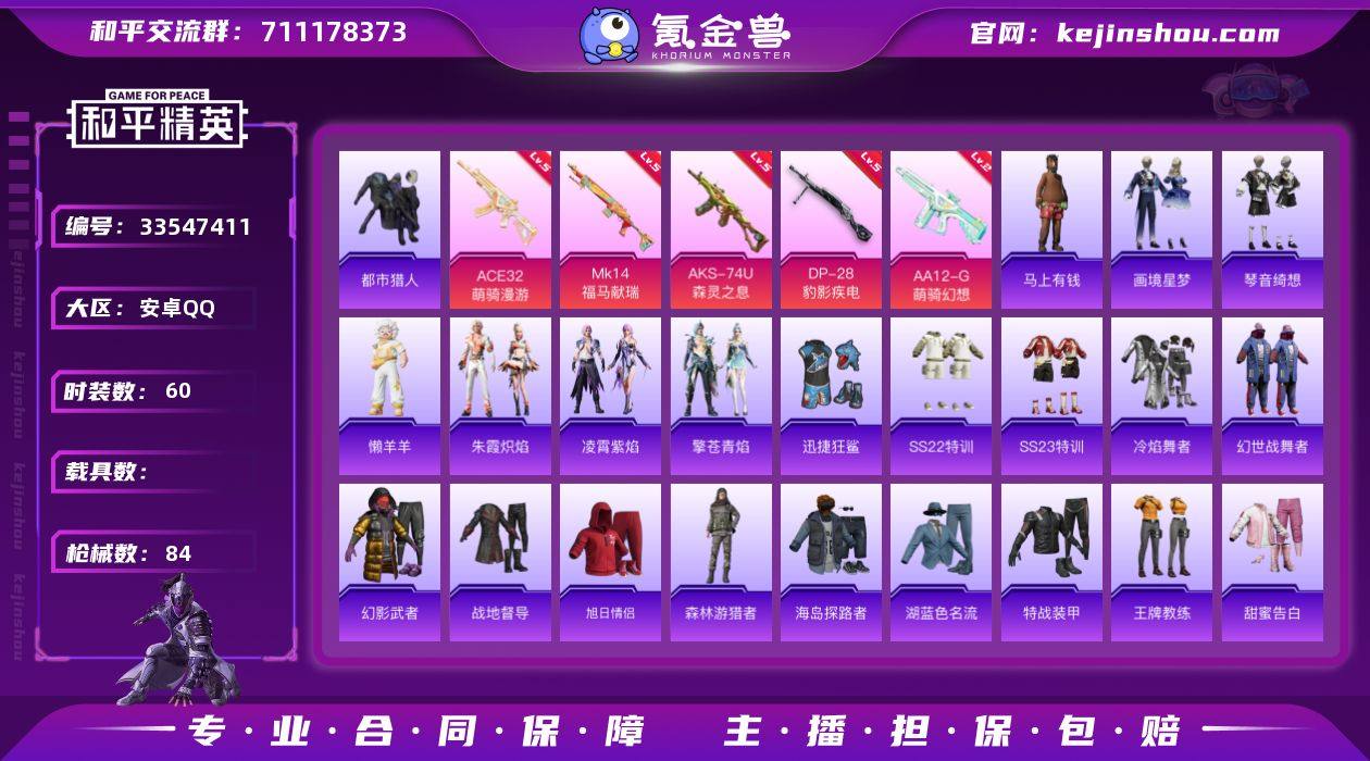 【FK19】60套装/枪械5/装备76/战备50/王牌印记1/热力值21835/五级ACE32-萌骑漫游/五级AKS-74U-森灵之息/五级MK14-福马献瑞/二级AA12-G-萌骑幻想/五级DP-28-豹影疾电/都市猎人/ACE32-萌骑漫游/AKS-74U-森灵之息/MK14-福马献瑞/AA12-G-萌骑幻想/DP-28-豹影疾电/炫彩糖果飞行器/星穹咏叹调降落伞/冷漠罗丽降落伞/炫彩糖果降落伞/炫彩糖果/马上有钱/朱霞炽焰/凌霄紫焰/擎苍青焰/懒羊羊/画境星梦/琴音绮想/AKM-破晓战魂/AKM-龙的传人/M16A4-幻世战舞者/M16A4-红色方程式/SCAR-L-夜灯/SCAR-L-炫彩节奏/M416-红色方程式/M416-蓝色火焰/GROZA-影袭/AUG-耀粉歌者/M762-天降萌叽/AC-VAL-天降萌叽/ACE32-画境星梦/ARX-凌霄紫焰/UZI-天降萌叽/UZI-红色方程式/UMP45-夜灯/UMP45-蓝色火焰/Vector-生命誓言/汤姆逊-天降萌叽/汤姆逊-奇异狩猎者/汤姆逊-耀粉歌者/MP5K-画境星梦/JS9-凌霄紫焰/P90-巳巳如意/SKS-炫彩节奏/VSS-星之彼岸/AMR-喜羊羊与灰太狼/M1加兰德-画境星梦/S12K-夜灯/S12K-幻世战舞者/AA12-G-画境星梦/M249-糯团青竹/DP-28-彩虹符号/MG3-幻世战舞者/MG3-第五大道/MG-36-凌霄紫焰/P92-凌霄紫焰/平底锅-凌霄紫焰/平底锅-画境星梦/SS22特训/SS23特训/冷焰舞者/幻世战舞者/幻影武者...