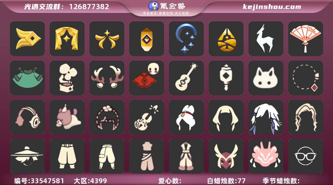 [18836433]安卓官服 邮箱账号 3珍稀物品 7毕业季 6毕业图 77蜡烛 【珍稀物品】白枭(帝企鹅发),透明蝶翼斗,彩虹围巾(五塑彩带斗) 【季节已毕业】风行季,表演季,欧若拉季(欧若拉),追忆季,夜行季,归巢季,九色鹿(九色鹿季) 【完成地图】晨岛,云野,雨林,霞谷,墓土(暮土),禁阁 【礼包】兔子(玉兔头饰)(玉兔发饰)(兔子发饰),四叶草(四叶草头饰),彩虹耳钉(彩虹耳饰),彩虹耳机,鹿角(圣诞鹿角),星球斗(星球夹克),福娃(福娃礼包)(春之日礼包)(铜钱斗),青衫落拓礼包,吉他(音韵吉他)(白吉他),小提琴(凯旋提琴),献瑞折扇礼包,灯笼(中秋灯笼),音乐桌(网易云留声机),奥利奥(周年庆抱枕) 【裤子】飞天裤(柔缎花边连)(九色鹿丝带裤),蓝绿裤(高领舞服),武士裤,搓澡巾 【面具】黄眉企鹅面具,夜行毕业面具(棕熊面具) 【面饰】黑框眼镜(粗框眼镜),红耳机 【项链】围巾(肩带) 【发型】留辫蘑菇头,飞天盘发(九色鹿丸子头),虚荣,归巢毕业发型(五塑彩羽发),若笠(箬笠) 【头饰】平顶帽,蓝色音乐会(蓝色音乐符),羽毛发饰(多羽发饰) 【斗篷】燕尾斗篷,遥鲲斗篷(双翼遥鲲斗),粉红绒毛斗篷(绒毛斗篷),绿芽 【配饰】鲲灯(追忆之书),相机(季卡相机),二重奏挂画(合奏挂画),雨伞,高音钢琴(白色高脚钢琴)