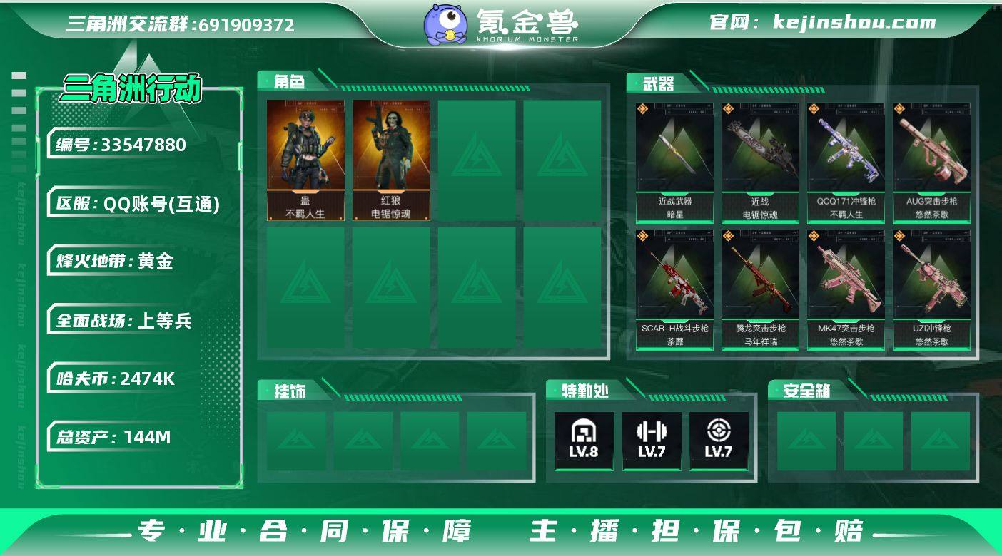 编号100087 不可二次 等级60 总资产144.7M 流动资产77.4M 哈夫币2474K 2刀 s8顶级安全箱 仓库lv8 训练中心lv7 靶场lv7 暗星 电锯惊魂