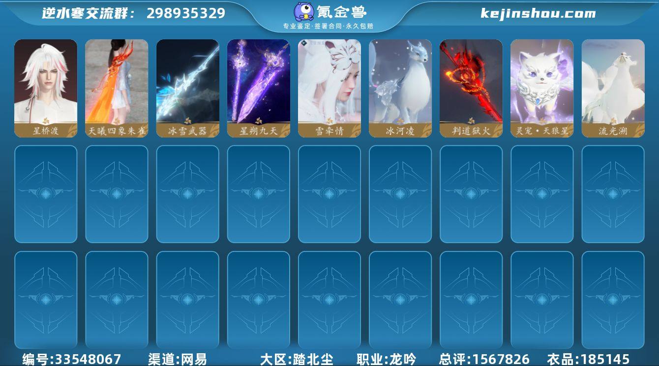 【区服】 瑶光听雪 【战力值】 148.71 【职业】 龙吟 【馆藏】 6级 【衣品值】 185145 【国色值】 58800 【已用天赏石】 19 【天霓染数量】 3 【充值称号】 把酒临风 【累计充值】 24336元 【剩余赠礼额度】 23091纹玉 【天霓染】 法度禅心*1, 云山惬尔*1, 陆离*1 【灵韵内功】 点明炉, 止水诀, 熔甲, 昆吾断玉, 锐锋 【天赏外观】 星桥渡, 雪牵情, 星辰武器, 狱火武器, 冰雪武器, 天曦四象·朱雀 【天赏祥瑞】 流光溯, 冰河凌 【祥瑞坐骑】 龙衔瑞焰, 金冠鼠鼠, 纵风甲车·玄, 幻琉晶, 狂霸天, 沉木行马, 星河转·银昼, 布丁, 星河转·赤夜, 骋风叱焰, 抟乌镇妖, 贺岁喜狮, 伯力, 咩郎, 墨流云·玄色, 墨流云·朱红, 墨流云·靛青, 赤龙驹, 奔虹赤, 踏星夜, 彩虹小马, 隐云涧, 西部驴仔, 空山闲, 银砂素波, 玉霄飞练 【商城外观】 雾都往事, 糖云蜜杏, 雾蓝星瞳, 晴岸涛吟, 甜宙漫游, 纯白月光, 桃花雪, 盛浪晴海, 金筹曜夜, 逸夏浮澜, 烹椒听雀, 青羽惊梦, 跃动心芒, 云腾游雾, 福禄金刚, 幻梦巡礼, 晴蓝逸思, 悬蛛结心, 玄喵夜行, 鳞骨逢幽, 乌夜禁巡, 紫微御宵, 衣香鬓影, 混天焚莲, 火鸾鸿衣, 金祷颂晖, 金粉绮梦, 烽火浮生, 林泽仙踪, 广寒遗客, 白灵幻尘, 灵鹿苍风, 法度禅心,...