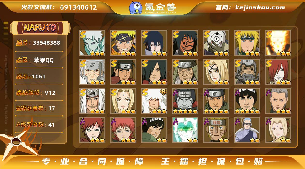 【HYC1856】VIP等级V12/战力1061W/S忍数量17/A忍数量41/二星A-波风水门「新春限定」/三星S-纲手「百豪」/二星A-纲手「侠隐江湖」/三星S-纲手/三星S-宇智波带土「十尾人柱力」/二星A-飞段「死司凭血」/五星A-猿飞阿斯玛/三星S-宇智波斑/三星S-猿飞日斩「秽土转生」/二星A-照美冥「五代目水影」/三星A-蝎/二星A-猿飞阿斯玛「秽土转生」/五星A-迈特凯/二星A-宇智波鼬「新春限定」/三星S-自来也/三星S-千手扉间「秽土转生」/2星旗木卡卡西「神威对决」/二星A-长十郎「六代目水影」/二星A-春野樱「百豪」/三星S-宇智波斑「白面具」/三星S-千手柱间/二星A-宇智波带土「暴怒」/二星A-黑土「四代目土影」/二星A-迪达拉「秽土转生」/二星A-药师兜「半蛇斗篷」/二星A-宇智波佐助「万花筒写轮眼」/二星A-我爱罗「忍界大战」/二星A-迪达拉/二星A-小南/二星A-漩涡鸣人「九尾查克拉」/二星A-猿飞木叶丸「博人传」/二星A-大蛇丸「晓」/二星A-宇智波鼬/三星S-宇智波佐助「永恒万花筒」/二星A-长门「青年」/三星A-飞段/二星A-桃地再不斩「漂泊武士」/三星S-漩涡鸣人·宇智波佐助/三星S-波风水门/三星S-漩涡鸣人 「九喇嘛连结」/二星A-秋道丁次「忍界大战」/二星A-旗木卡卡西「万花筒写轮眼」/二...