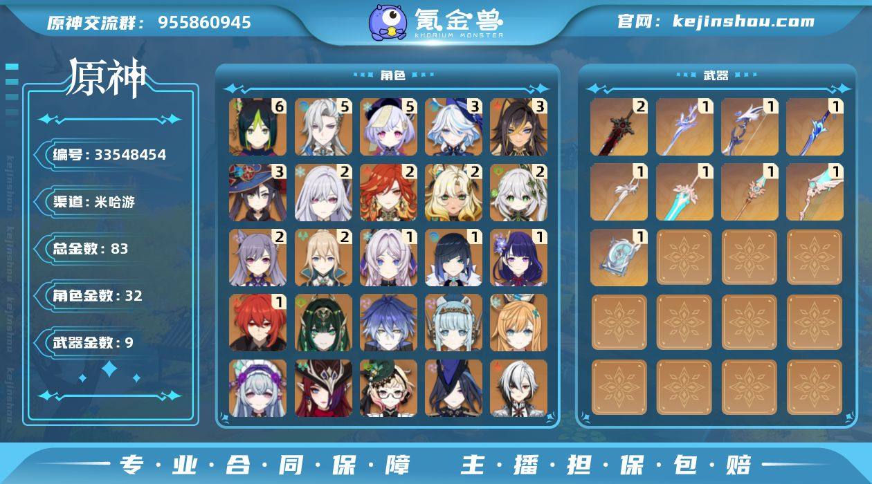 83黄!冰水战舰!纳塔战舰!龙芙万希!月感电战舰!超绽放!融仆!5命龙王!满命提纳里!2+1丝柯克!3命芙宁娜!2命火神!2命希诺宁!2命草神!1+1夜兰!1命茜特菈莉!1命雷神!菲林斯!伊涅芙!爱可菲!仆人!克洛琳德!恰斯卡!万叶!钟离!心海!满命提纳里 五命七七,五命那维莱特 三命莫娜,三命迪希雅,三命芙宁娜 二命刻晴,二命琴,二命纳西妲,二命希诺宁,二命玛薇卡,二命丝柯克 一命迪卢克,一命雷电将军,一命夜兰,一命茜特菈莉 枫原万叶,优菈,达达利亚,钟离,珊瑚宫心海,艾尔海森,娜维娅,阿蕾奇诺,克洛琳德,艾梅莉埃,恰斯卡,梦见月瑞希,爱可菲,伊涅芙,菲林斯,奈芙尔 拥有武器: 狼的末路,天空之翼,四风原典,天空之傲,风鹰剑,天空之脊,波乱月白经津,若水,苍耀 2精武器: 狼的末路 1精武器: 天空之翼,四风原典,天空之傲,风鹰剑,天空之脊,波乱月白经津,若水,苍耀
