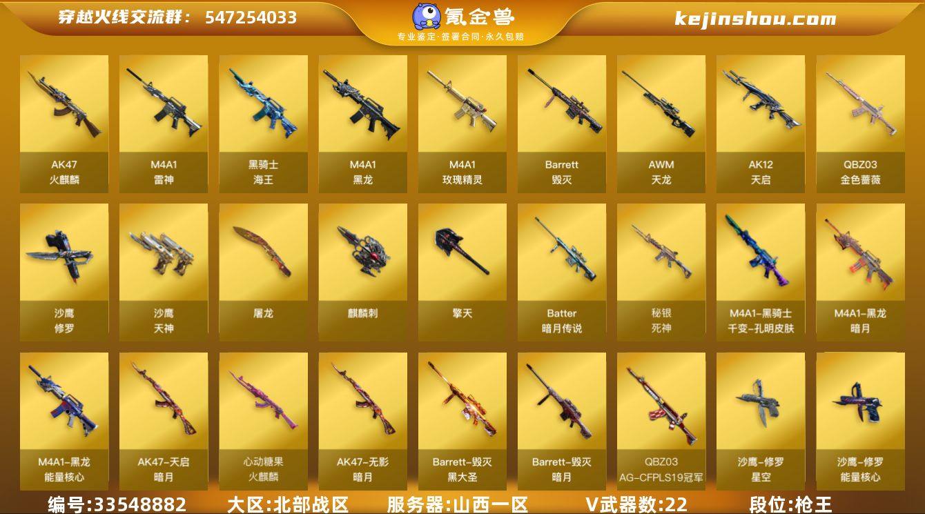 【ky7013】山西一区-23V-0王者武器数-0炫金武器数 【热门武器】:QBZ03-金色蔷薇,沙鹰-修罗*2 【皮肤】:QBZ03-AG-CFPLS19冠军,火麒麟-心动糖果,毁灭-暗月*2,毁灭-黑大圣皮肤,M4A1-千变-孔明皮肤,黑龙-能量核心,黑龙-暗月,无影-暗月*2,死神-秘银,天启-暗月,修罗-能量核心,修罗-星空,天神-暗月*3 【角色】:零,暗夜-X,灵狐者-X,潘多拉-X,潘多拉-甜心教官,邱刚敖,斯沃特-X,蜀雪,影武者-X 【暴走生化】:超级对讲机 【英雄级武器】:AK47-火麒麟*2,M4A1-黑龙,M4A1-雷神,AK12-天启,QBZ03-金色蔷薇,M4A1-玫瑰精灵,黑骑士-海王*2,AWM-天龙,Barrett-毁灭,Barrett-暗月传说,沙鹰-修罗*2,沙鹰-天神,屠龙,擎天,麒麟刺,尼泊尔-雷霆,高爆手雷-雷霆,闪光弹-雷霆,烟雾弹-雷霆 【其他武器】:源-千变,源·火麒麟*2,魂·火麒麟-百城*2,源·雷神*3,御·雷神-烈虎,御·雷神-葫芦兄弟,源·黑骑士,源·无影,魂-死神-机甲核心,御·超新星-圣诞,魂·QBZ03-金色蔷薇-萌杀,源·猎神*2,源·天龙,魂·天龙-彼岸花,魂·裁决-神秘按键,源·毁灭,魂·毁灭-青帝,御·毁灭-黑大圣*2,灵·Barrett-朱雀-炫光,加特林-炼狱-掌火 【道具】:XROCK炫彩背包,战舰背包,夺...