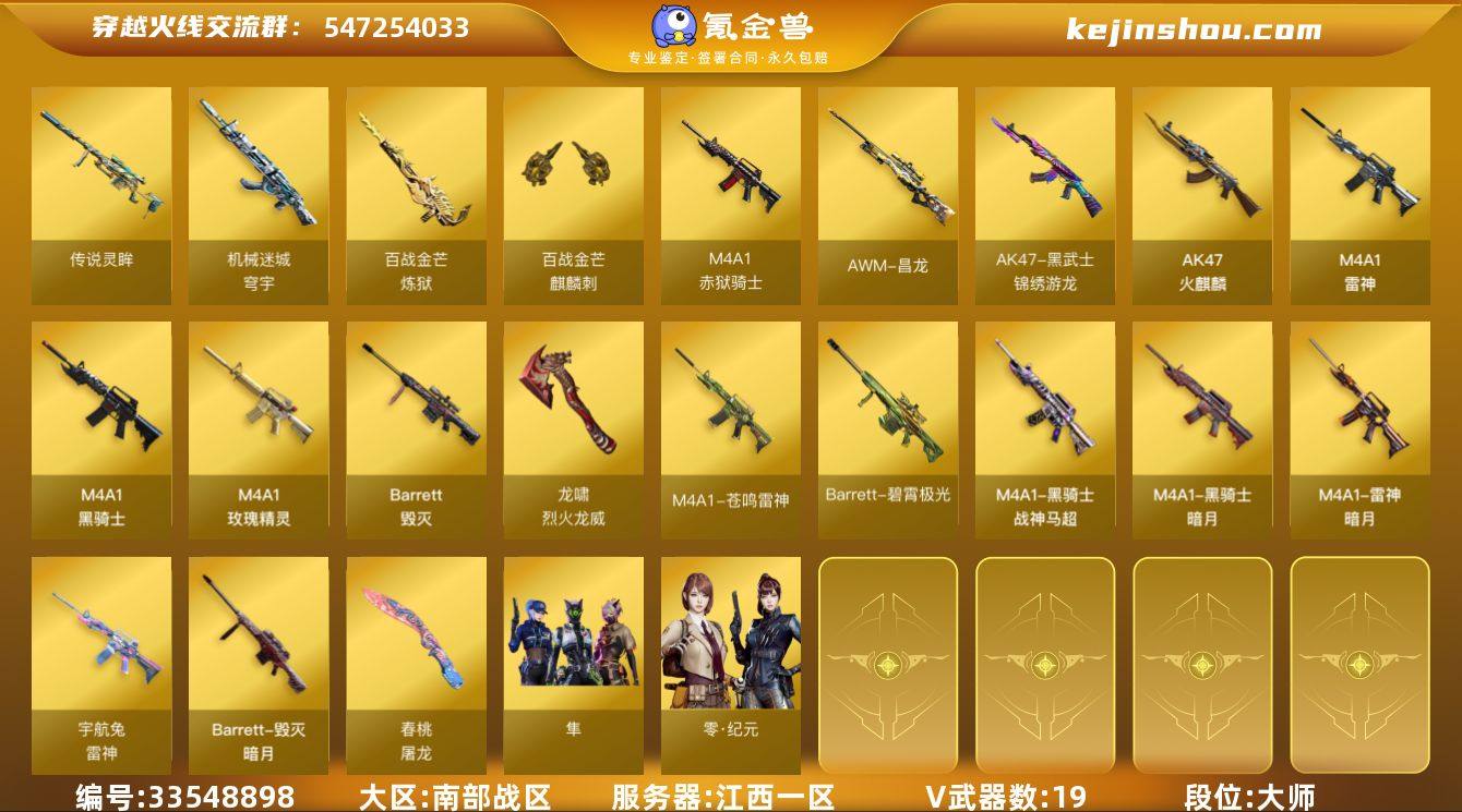 【ky6947】江西一区-21V-0王者武器数-0炫金武器数 【传说武器】:传说灵眸 【热门武器】:传说灵眸,M4A1-青龙,M4A1-黑骑士 【音效卡】:屠龙-电竞之星-竞星跃动音效卡,Barrett-毁灭音效卡,HK417-朱雀-电竞之星-竞星跃动音效卡,Barrett-碧霄极光音效卡,麒麟刺-百战金芒-盛典舞曲音效卡,炼狱-百战金芒-庆典舞曲音效卡,AWM-昌龙-怀旧音效卡 【皮肤】:雷神-暗月,雷神-宇航兔皮肤,M4A1-再燃火线,毁灭-暗月,毁灭-英雄计划 皮肤,黑骑士-暗月,黑骑士-战神马超,黑骑士-破界 皮肤,修罗-百战金芒 皮肤,屠龙-春桃 皮肤,轻型军用手斧-再燃火线 【角色】:隼,零·纪元,奇洋探员,乔伊教练,修道士,云海玲珑,葵-阿尔法武装,幻面灵狐,暗夜-X,飞虎队-X,风暴女,麻雀,曼陀罗-X,潘多拉-甜心教官,潜龙队-X,斯沃特-X,蜀雪,游珑儿,潘多拉-N,团团 【人偶武器】:COP-旗袍,迷你牛牛,生化手雷-机甲核心*2,灵狐娃娃手雷 【暴走生化】:双面神-竞魂 【挑战大师】:冰龙粉碎者-白马银枪,激光毁灭者III-白马银枪 【英雄级武器】:AK47-火麒麟,M4A1-雷神*2,M4A1-黑骑士,M4A1-青龙,黑武士-锦绣游龙,M4A1-玫瑰精灵,HK417-朱雀-电竞之星,机械迷城-穹宇,Barrett-...