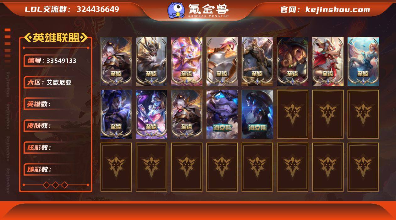[18837869]17神话 32限定 19传说 26史诗 183皮肤 55炫彩 172英雄 可二次 可修改实名 【至臻】至臻 黑色玫瑰假面舞会 卡特琳娜,至臻 源计划:正义 艾瑞莉娅,至臻 魔女 婕拉,至臻 太空律动 节奏幻师 璐璐,至臻 福牛守护者 菲奥娜,至臻 源计划:逆流 塞拉斯,至臻 魅惑女巫 莫甘娜,至臻 神凰行者 烈羽焰凰 霞,至臻 海之歌 萨勒芬妮,至臻 至高天 奎桑提,至臻 太空律动 魔音海妖 娜美,水晶圣骑 塔莉垭 【海克斯】海克斯 吉格斯,海克斯 玛尔扎哈 【限定】养蜂人 辛吉德,生化领主 泰达米尔 【情人节限定】觅心萝莉 金克丝,碎心之拳 蔚,怦然心动 凯特琳 【赛季限定皮】胜利女神-菲奥娜,胜利女神 娑娜 【冠军限定系列】S1FNC 酒桶,S1FNC 迦娜,S3 SKT T1 劫,S3 SKT T1 贾克斯,S3 SKT T1 薇恩,S4 SSW 泰隆,S6 SKT T1 扎克 【冰雪节限定】阿木木:“主人不要我了”,圣诞糖果棒 厄运小姐,圣诞玩偶 波比,雪默丁格,北极星神 黛安娜 【泳池派对】泳池派对 吉格斯,泳池派对 雷克顿,泳池派对 李青 【万圣节限定】大魔法锅 布里茨,魅惑女巫 菲奥娜,南瓜头 费德提克,死亡誓约 劫,无头骑士 赫卡里姆 【年限】烈焰美人 薇恩 【周年】7周年 泰隆,10周年 凤凰,10周年 霞 【其他限定/神话皮】十五周年纪念...