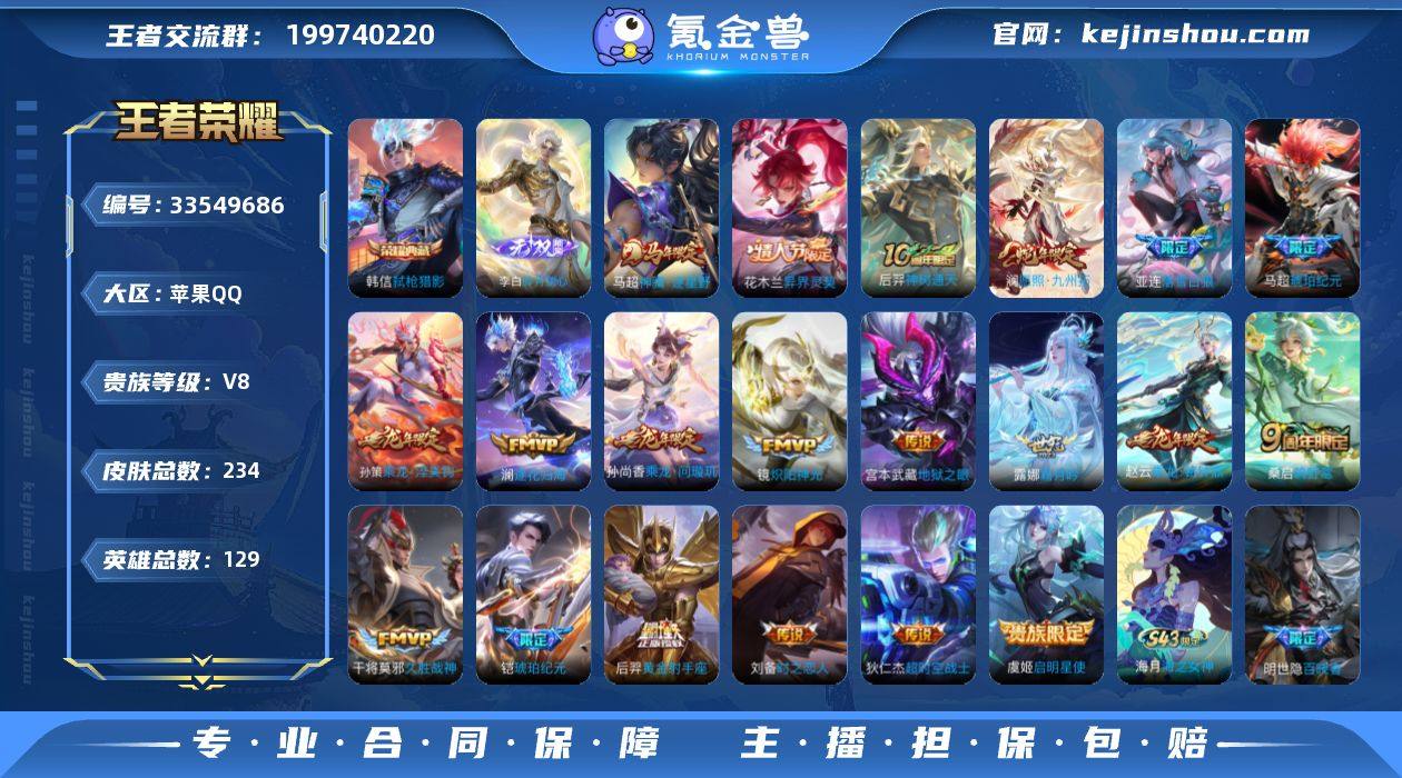 实名: 可修改 贵族等级: V8 英雄数: 129 皮肤数: 234 荣耀水晶: 弑枪猎影 无双皮: 碎月剑心 传说皮: 黄金射手座,久胜战神,炽阳神光,地狱之眼,时之恋人-刘备,超时空战士-狄仁杰,霜月吟,澜逐花归海,琥珀纪元铠,琥珀纪元马超,乘龙·问璇玑,乘龙·铭钟鼎,乘龙·淬吴钩,落雪白狼,神树通天,神骥·逐星野,异界灵契-花木兰 限定皮: 孙行者,玉兔公主,匿光启智者,五谷丰年,鸣野蒿,陌上桑,逐霄战戟,愿照·九州拓