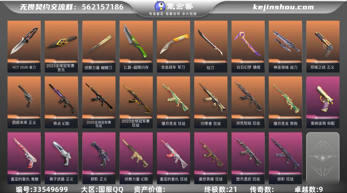 【精品下三段!5.2W库存.23冠军套.爆爆.VCT】【套装】:2023全球冠军赛套装,VCT 2026 赛季套装,《英雄联盟:双城之战》套装 【英雄】:幻棱,炼狱,维斯,暮蝶,钛狐,壹决,铁臂,捷风,雷兹,幽影,不死鸟,贤者,猎枭,蝰蛇,零,芮娜,奇乐,尚勃勒,霓虹,斯凯,夜露,星礈,K/O,海神,盖可,黑梦,钢锁 【近战武器】:近战武器-2023全球冠军赛 苦无,近战武器-VCT 2026 篆刀,近战武器-影钩,近战武器-侦察力量 蝴蝶刀,近战武器-剥皮小刀,近战武器-紫金爪刀,近战武器-镭切,近战武器-超限闪存 匕首,近战武器-合金战车 军刀,近战武器-祜刀,近战武器-白日幻梦 撬棍,近战武器-神圣领域 战刀 【狂徒】:狂徒-2025全球冠军赛,狂徒-2023全球冠军赛,狂徒-归零者,狂徒-洪荒怒焰,狂徒-偃月苍龙,狂徒-堕天遗武,狂徒-掠影,狂徒-盖世英雄,狂徒-盖亚的复仇 【幻影】:幻影-奇点,幻影-侦察力量,幻影-超限闪存,幻影-合金战车,幻影-神圣领域 【戍卫】:戍卫-浮光跃金,戍卫-花漾粉红,戍卫-月球哨兵 【獠犬】:獠犬-神圣领域,獠犬-模拟赫兹,獠犬-数码咒术 【冥驹】:冥驹-偃月苍龙,冥驹-白日幻梦,冥驹-花漾粉红,冥驹-模拟赫兹,冥驹-星云暗涌 【飞将】:飞将...