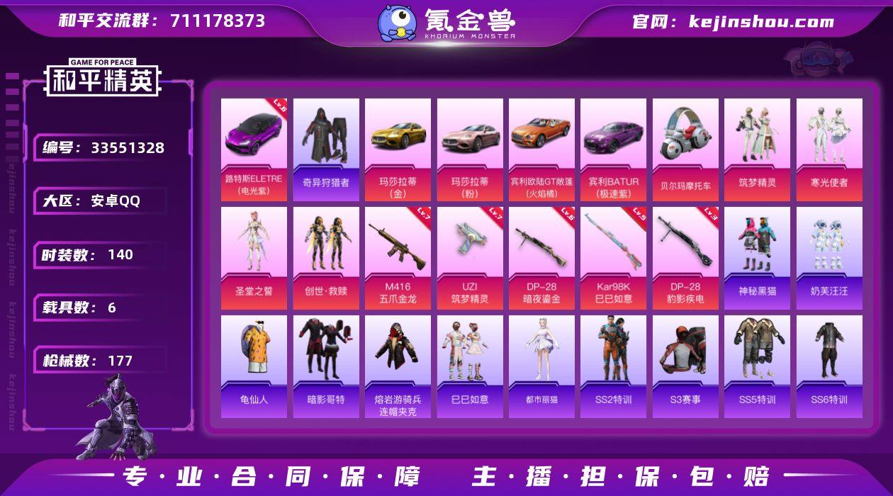【金玛莎/满级吉普路特斯/奇异狩猎者/暗影哥特红眼罩七级M4五爪金龙】安卓 手Q-4粉装-6特效枪-6载具-2粉色飞行器-69237热力值-5王牌印记-140套装-177枪皮【红色载具】:路特斯ELETRE(电光紫)(六级)【热门品类】:套装-奇异狩猎者,套装-SS1特训,套装-龟仙人,套装-暗影哥特,熔岩游骑兵连帽夹克【粉色套装】:粉装-筑梦精灵,粉装-寒光使者,角色-圣堂之誓,套装-创世·救赎【粉色枪皮等级】:M416-五爪金龙(七级),UZI-筑梦精灵(七级),UMP45-萌骑冒险(一级),Kar98K-巳巳如意(五级),DP-28-暗夜鎏金(六级),DP-28-豹影疾电(三级)【粉色载具】:路特斯ELETRE(电光紫),玛莎拉蒂Ghibli(金),玛莎拉蒂Ghibli(粉),宾利欧陆GT敞篷(火焰橘),宾利BATUR(极速紫),布尔玛摩托车【粉色枪皮】:M416-五爪金龙,UZI-筑梦精灵,UMP45-萌骑冒险,Kar98K-巳巳如意,DP-28-暗夜鎏金,DP-28-豹影疾电【粉色飞行器】:粉樱探戈飞行器,超新星飞行器