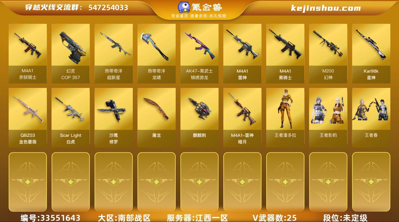 江西一区-29V-12王者武器数-0炫金武器数 【热门武器】:QBZ03-金色蔷薇,Scar Light-白虎,M200-幻神,Kar98K-星神,M4A1-黑骑士,加特林-炼狱,COP 357-幻灵*3,沙鹰-修罗 【王者炫金武器】:高爆手雷-雷霆王者*2 【皮肤】:幻神-冠军之幻,M200-幻神-N9-2022MVP,雷神-暗月,屠龙-春桃 皮肤 【角色】:战地猎狐,王者春,王者影豹,王者潘多拉,奇洋探员,乔伊教练,修道士,云海玲珑,炽天使,暗夜-X,电竞少女,芳心审判者,飞虎队-X,虎妞,娟娟,兰-新年限定,0号玩家,灵狐者-职业经理,麻雀,曼陀罗-X,潘多拉-X,潜龙队-X,蛇姬,铁骑荣耀,兔囡囡,游珑儿,团团 【人偶武器】:AWM-灵狐-15周年嘉年华,迷你牛牛,迷你火种,生化手雷-机甲核心 【暴走生化】:超级对讲机 【挑战大师】:AK47-冰龙粉碎者,冰龙粉碎者-白马银枪,试炼破坏者III 【英雄级武器】:M4A1-雷神,M4A1-黑骑士,Scar Light-白虎,QBZ03-金色蔷薇,黑武士-锦绣游龙,超新星-热带奇洋,M4A1-雷霆王者-觉醒版,M200-幻神,Kar98K-星神,加特林-炼狱,沙鹰-修罗,COP 357-幻灵*3,屠龙*2,麒麟刺,龙啸-热带奇洋,屠龙-电竞之星,高爆手雷-幻灵*2,手雷-热带奇洋,高爆手雷-雷霆王者-觉醒版*2,高...