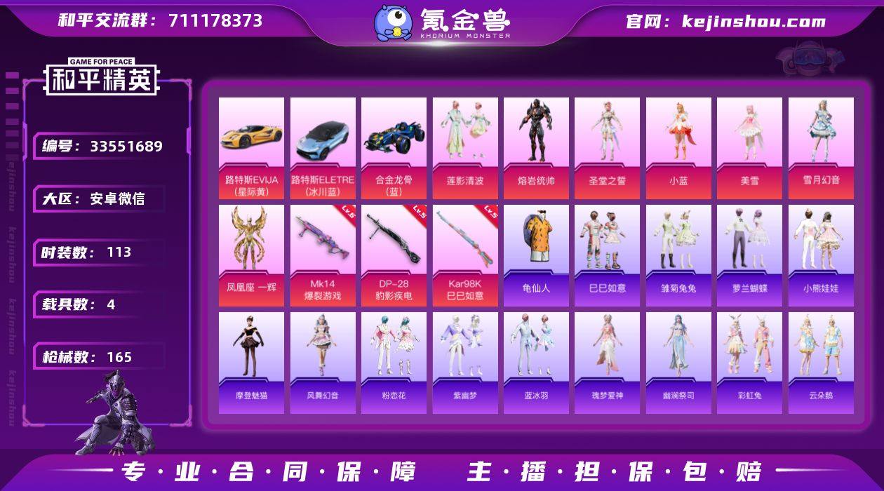 113套装/枪械4/装备192/载具4/战备132/王牌印记10/热力值53342/五级Kar98K-巳巳如意/六级Mk14-爆裂游戏/五级Mk14-福马献瑞/五级DP-28-豹影疾电/龟仙人/莲影清波/熔岩统帅/圣堂之誓/小蓝/美雪/雪月幻音/凤凰座 一辉/路特斯EVIJA(星际黄)/路特斯ELETRE(冰川蓝)/合金龙骨(蓝)/僚机-萌酷奶龙/Kar98K-巳巳如意/Mk14-爆裂游戏/Mk14-福马献瑞/DP-28-豹影疾电/炫彩糖果飞行器/幻海仙踪飞行器/未来歌姬降落伞/莲影清波降落伞/圣堂之誓降落伞/巴啦啦小魔仙降落伞/精灵梦叶罗丽降落伞/临安公主降落伞/雪月幻音降落伞/幻海仙踪降落伞/幻彩电音降落伞/双重狂想降落伞/炫彩糖果降落伞/巳巳如意/炫彩糖果/套装-马上有钱/雏菊兔兔/萝兰蝴蝶/小熊娃娃/摩登魅猫/风舞幻音/粉恋花/紫幽梦/蓝冰羽/瑰梦爱神/幽澜祭司/彩虹兔/云朵鹅/雪绒豹/混沌火种/蓝海鲸歌/AUG-冰晶雪宝/AKM-灼热熔岩/AKM-破晓战魂/AKM-霓虹街区/AKM-龙的传人/M16A4-幻世战舞者/M16A4-红色方程式/M16A4-莲影清波/M16A4-千金淑猫/SCAR-L-夜灯/SCAR-L-炫彩节奏/SCAR-L-玉兔迎春/SCAR-L-红色方程式/M416-糯团青竹/M416-红色方程式/M416-蓝色火焰/AUG-耀粉歌者/AUG-闲梦青缨/M762-云朵鹅/AC-VAL-快闪甜心/蜜獾-天降萌叽/UZI-啾咪啾...