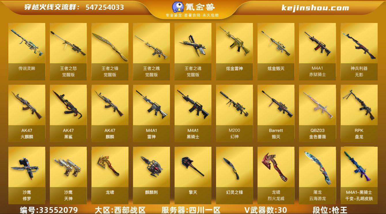 【ky6839】四川一区-38V-16王者武器数-2炫金武器数 【传说武器】:传说灵眸 【热门武器】:传说灵眸,QBZ03-金色蔷薇,M200-幻神,M4A1-黑骑士*3,RPK-盘龙,雷神-小红,COP-白鲨,沙鹰-修罗 【王者炫金武器】:王者之魄高爆手雷*4,王者之魄闪光弹*5,王者之魄烟雾弹*2,炫金雷神,炫金毁灭 【音效卡】:Barrett-极光音效卡 【皮肤】:幻神-纸灯龙皮肤,裁决-星际旅行 皮肤,雷神-星空,雷神-虎将,火麒麟-雷神,火麒麟-心动糖果,毁灭耀金皮肤,毁灭-冠军之怒,毁灭-英雄计划 皮肤,M4A1-千变-孔明皮肤,黑骑士-地狱火,黑武士-典韦皮肤,修罗-冠军之魂,屠龙-春桃 皮肤,龙啸-纸灯龙皮肤*2,擎天-冠军之击,麒麟刺-荣耀世冠白鲨 【角色】:葵,司雨,王者零-华冠丽服,王者凌霄,云海玲珑,嘉年华灵狐,猎狐者-追月,灵狐-花神,灵狐者-黄金海岸,灵狐者-七夕宝贝,灵狐者-职业经理,曼陀罗-X,萌儿,潘多拉-X,潘多拉-甜心教官,斯沃特-X 【人偶武器】:雷神-小红,COP-白鲨,AWM-灵狐-15周年嘉年华,COP-旗袍,夺魂,迷你巨石泰坦-魔花研究所 【挑战大师】:冰龙粉碎者-白马银枪*2,激光毁灭者III-白马银枪,激光毁灭者III*2,AA12-擎天柱III 【英雄级武器】:AK47-火麒...