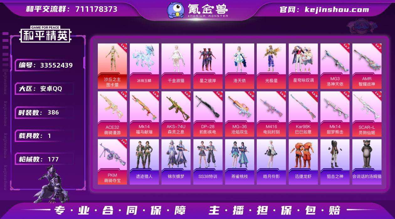 安卓QQ区,九个王牌印记,4个卓越印记,二级图卡盟,五个粉装,汤姆猫,小丑鱼,菠萝,一个马皮肤冰绡玉鳞,10个粉色飞行器,三级灵驹仙姬,七级智耀战神,七级洛神天依MG3。