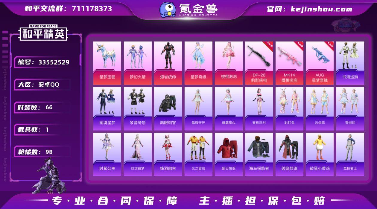 【梦幻火箭aug星梦奇缘樱桃泡泡精品号】安卓 手Q-5粉装-5特效枪-1载具-3粉色飞行器-28586热力值-1王牌印记-66套装-98枪皮 【热门品类】:粉装-梦幻火箭 【粉色套装】:粉装-梦幻火箭,角色-熔岩统帅,角色-星梦奇缘,角色-樱桃泡泡,角色-罪夜之冕 【粉色枪皮等级】:AUG-星梦奇缘(三级),ACE32-萌骑漫游(一级),Mk14-樱桃泡泡(五级),Mk14-福马献瑞(五级),DP-28-豹影疾电(五级) 【粉色载具】:星梦玉骢 【粉色枪皮】:AUG-星梦奇缘,ACE32-萌骑漫游,Mk14-樱桃泡泡,Mk14-福马献瑞,DP-28-豹影疾电 【粉色飞行器】:炫彩糖果飞行器,梦幻火箭飞行器,星梦奇缘飞行器 【粉色降落伞】:梦幻火箭降落伞,洛神天依降落伞,星梦奇缘降落伞,樱桃泡泡降落伞,绯穹魔姬降落伞,炫彩糖果降落伞,暮色玫影降落伞,罪夜之冕降落伞 【稀有套装】:套装-雪国风尚,套装-炫彩糖果,套装-马上来财,套装-迅捷龙虾,套装-遗迹猎人,套装-晶辉守护,角色-糖霜甜心,角色-蜜桃派对,套装-彩虹兔,套装-云朵鹅,套装-雪绒豹,角色-时希公主,角色-玫纹锢梦,角色-绛羽幽主,套装-书海巡游,套装-画境星梦,套装-琴音绮想,角色-霜刃之御,套装-粉彩缠枝,套装-雨过天青,套装-红釉青花,角色-...