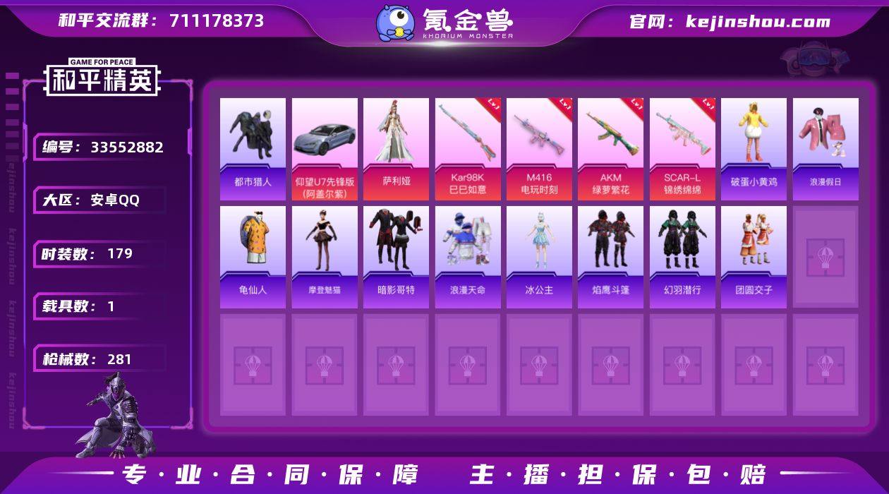 YZJ16507-可二次 安卓Q-3稀有1载具7粉装8特效枪11热门179套装281枪皮【极品小身法号 地铁满天赋 特权卡至27年 5卓越3传奇1绝世 新火箭少女 都市 牛仔外套[浅蓝色牛仔衬衣] 炫光之旅 冷漠罗丽 蓝粉小螳螂 小丑鱼 蜘蛛侠 菠萝】 80806热力值 17印记 历史绝世王牌22星 【3稀有】 奇异狩猎者 都市猎人 浪漫天命 【1载具】 仰望U7先锋版(阿盖尔紫) 【7粉装】 梦幻火箭 萨利娅 时空协奏火花 金丰海韵 异瞳寒姬 炫光之旅 冷漠罗丽 【8特效枪】 AKM-暮色玫影 (3级) SCAR-L-锦绣绵绵 (5级) M416-电玩时刻 (5级) AKM-绿萝繁花 (5级) Kar98K-巳巳如意 (5级) DP-28-豹影疾电 (5级) Mk14-甜梦熊击 (5级) Mk14-福马献瑞 (5级) 【11热门】 8号机 Mark.06 小丑鱼 龟仙人 浪漫假日 暗影哥特 团圆交子 破蛋小黄鸡 M762-奇异狩猎者 M24-奇异狩猎者 S686-奇异狩猎者 【1飞行器】 龙翔九天飞行器 【2头盔】 梦幻火箭头盔 深海小丑鱼头盔 营地ID:932563937