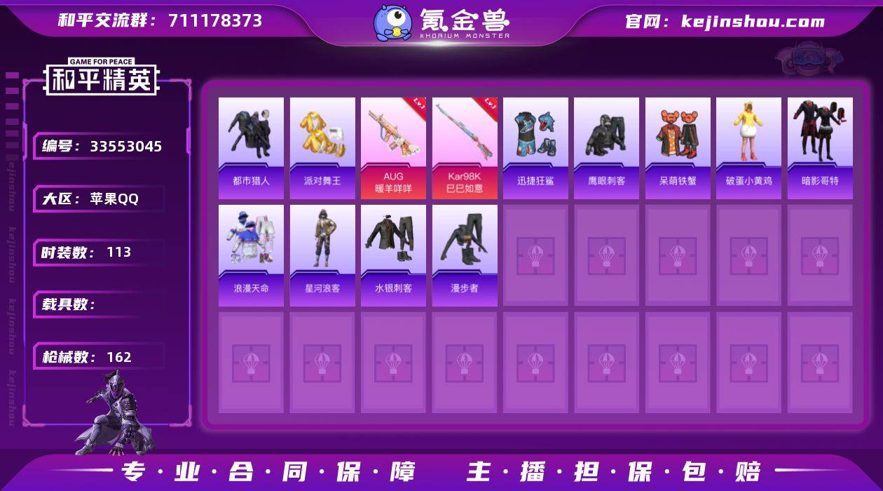 YZJ16369-可二次-苹果Q-4稀有4粉装9特效枪10热门113套装162枪皮 43688热力值 极品小身法素材号 小雾神同款 地铁满天赋 4词条小龙AUG 230扭蛋碎片未使用 幻影战神 荧海星豚 花中眠 都市 金鞋 红眼罩 深海小丑鱼 天命 鲨鱼服 菠萝头 满级AUG暖羊 7印记 历史卓越王牌16星 【4稀有】 都市猎人 浪漫天命 派对舞王 派对舞王(金靴子) 【4粉装】 荧海星豚 幻影战神 花中眠 罪夜之冕 【9特效枪】 AKS-74U-森灵之息 (5级) Kar98K-巳巳如意 (5级) DP-28-豹影疾电 (4级) AUG-暖羊咩咩 (5级) Mk14-甜梦熊击 (5级) Mk14-福马献瑞 (3级) AA12-G-萌骑幻想 (2级) UMP45-萌骑冒险 (1级) ACE32-萌骑漫游 (3级) 【10热门】 呆萌铁蟹 鹰眼刺客 迅捷狂鲨 深海小丑鱼 暗影哥特 星河浪客 水银刺客 漫步者 破蛋小黄鸡 极速红龙 【1背包】 金羽特工背包 营地ID:963512619