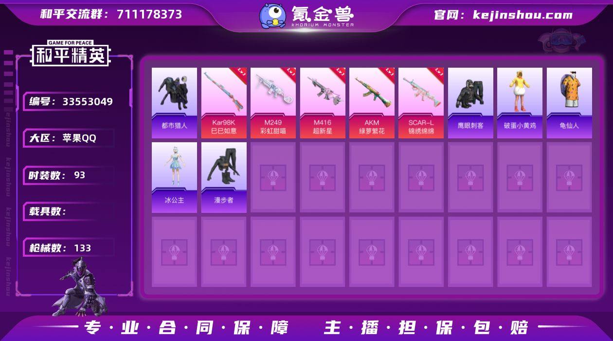 YZJ16835 不可二次 苹果Q-1稀有2粉装7特效枪5热门93套装133枪皮 极品小号 地铁满天赋 双字ID(妄嵜)8位数Q不带4! M4超新星 幻影飞狐 都市 冰公主 6级M249彩虹甜喵 满级AK绿萝 36470热力值 5印记 历史超级王牌12星 【1稀有】 都市猎人 【2粉装】 梦幻火箭 幻影飞狐 【7特效枪】 SCAR-L-锦绣绵绵 (5级) M416-超新星 (3级) AKM-绿萝繁花 (5级) Kar98K-巳巳如意 (5级) DP-28-豹影疾电 (5级) M249-彩虹甜喵 (6级) AA12-G-萌骑幻想 (4级) 【5热门】 龟仙人 鹰眼刺客 漫步者 破蛋小黄鸡 极速红龙 【1头盔】 梦幻火箭头盔 【1背包】 深海小丑鱼背包 营地ID:941004656