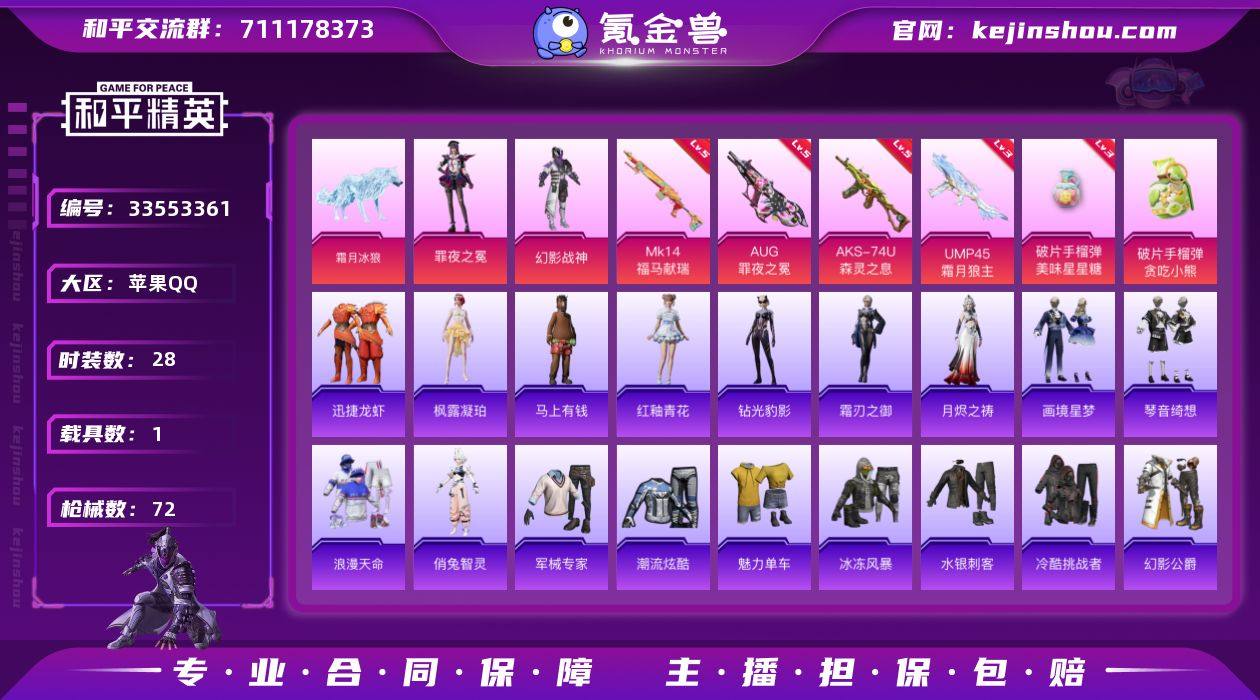 【满地铁天赋 仓库1200+红装碎片】YXc29264-【无二次协助处理】【因赛季更新游戏段付以上号为准!】 苹果Q-2稀有2粉装3特效枪1热门28套装72枪皮,,1印记,历史超级王牌, 【2稀有】,AKM-缤纷海域,浪漫天命, 【1载具】 霜月冰狼 【2粉装】,幻影战神,罪夜之冕, 【5特效枪】,AKS-74U-森灵之息,(5级),AUG-罪夜之冕,(5级),Mk14-福马献瑞,(5级),UMP45-霜月狼主(3级)碎片手榴弹-美味星星糖(3级) 【1热门】,水银刺客, 【2头盔】,幻影战神头盔,金羽特工头盔, 【3背包】,幻影战神背包,深海小丑鱼背包,金羽特工背包 【粉色枪皮等级】:UMP45-霜月狼主(三级UMP45-霜月狼主),AUG-罪夜之冕(五级AUG-罪夜之冕),AKS-74U-森灵之息(五级AKS-74U-森灵之息),Mk14-福马献瑞(五级Mk14-福马献瑞),破片手榴弹-美味星星糖(三级)