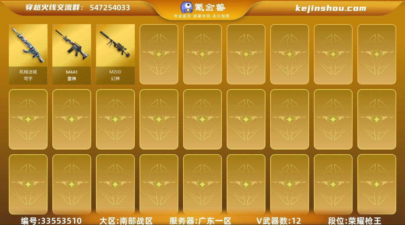 【ky7025】广东一区-13V-0王者武器数-0炫金武器数 【热门武器】:M200-幻神 【角色】:斗烈龙骑,兰-新年限定,兰妹妹,曼陀罗-X,铁骑荣耀,兔囡囡,潘多拉-N,团团 【人偶武器】:灵狐娃娃手雷 【英雄级武器】:M4A1-雷神,机械迷城-穹宇,M200-幻神,Kar98K-量子之心,扳手-量子之心,屠龙-斗烈龙驹,高爆手雷-量子之心,闪光弹-量子之心*3,烟雾弹-量子之心 【其他武器】:源·火麒麟,源·黑骑士,源·天龙,魂·Barrett-朱雀-锦鲤,加特林-炼狱-掌火,魂·天神-宇航兔兔 【道具】:炫彩背包,超级背包,绿色巨人,灵魂忍者,迷雾幽灵,疯狂宝贝*2,生化弹匣,夺命之镰,防化服*3,枪王排位28赛季金色流光,枪王排位29赛季金色流光,电玩兔兔表情,防弹头盔*2,防弹衣*2,C4工具钳,手雷包 【特殊枪械】: