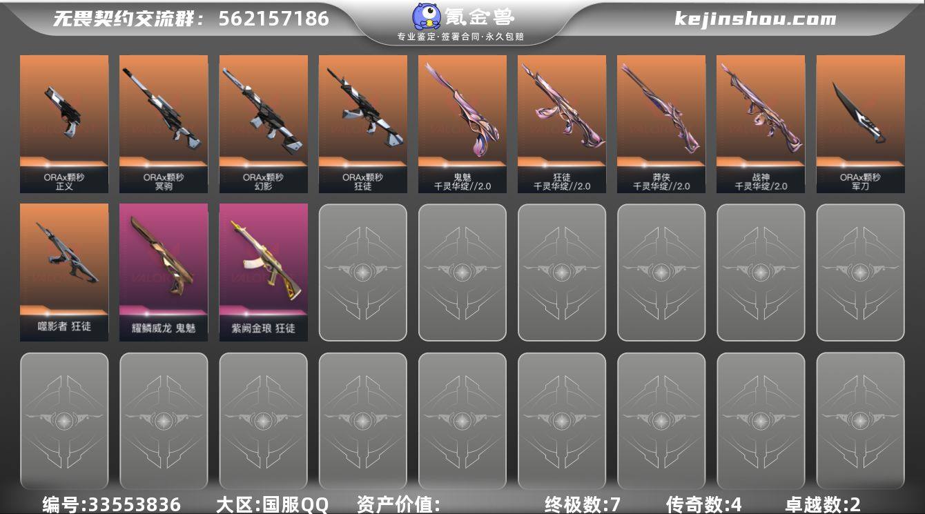 【PTWW3772】LV等级184/皮肤总价值24450/段位未定级/总皮肤数量21/刀皮数量2/枪皮数量19/套装数量2/具体详情请看图/千灵华绽//2.0 套装/ORAx颗秒/幻棱/炼狱/维斯/暮蝶/钛狐/壹决/铁臂/捷风/雷兹/幽影/不死鸟/贤者/猎枭/蝰蛇/零/芮娜/奇乐/尚勃勒/霓虹/斯凯/夜露/星礈/K/O/海神/盖可/黑梦/钢锁/流风回雪/ORAx颗秒 军刀/狂徒-噬影者/狂徒-ORAx颗秒/狂徒-千灵华绽//2.0/狂徒-紫阙金琅/幻影-ORAx颗秒/冥驹-ORAx颗秒/莽侠-千灵华绽//2.0/战神-千灵华绽//2.0/标配-超能偶像/正义-ORAx颗秒/正义-超限闪存/正义-复古浪潮/正义-纳米打击/鬼魅-千灵华绽//2.0/鬼魅-耀鳞威龙/鬼魅-流星兵团/终章:激斗汉堡 卡面/进入射程 卡面/《双城之战》拥抱 卡面/精灵大战 卡面/欢迎来到底城 卡面/南瓜盛典 卡面/钢弓与箭弦 卡面/修车达人 卡面/正义的化身 卡面/终章:生意人麦宝 卡面/铁之华 卡面/时间到 卡面/最高舞台 卡面/声感陷阱设计图 卡面/梦幻奶茶 卡面/终章:打造专属狂徒 卡面/趁热吃 卡面/源能反应 卡面/零点嗅探设计图 卡面/终章:瓦娃脸雪糕 卡面/表象之下 卡面/沙雕爆能器 卡面/清除名单 卡面/没有什么能逃过我的眼睛 卡面/天台狂欢 卡面/代号红色 卡面/新兵报到 卡面/V契约 卡面/无畏...