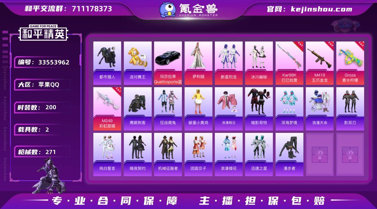 YZJ16250-可二次-苹果Q-6稀有2载具11粉装9特效枪24热门-连体王者小国司马懿 138皮肤1珍品传说7传说42史诗-详情看图 上号为准-【精品身法号 伤感小雾神套装 高印记 迈凯伦塞纳 蓝玛Q 火箭少女 小白龙 女娲灵识 第五大道 金鞋 都市 双马尾 红眼罩 天命 蜘蛛侠 小丑鱼 小黄鸭 粉团憨憨 晶辉守护 动感兔斯基 憨乐熊二 萌兔 多款热门满级特效枪 幻影战神头盔 粉熊背包 6款飞行器】200套装271枪皮 89187热力值 19印记 历史超级王牌16星 【6稀有】 奇异狩猎者 AKM-缤纷海域 都市猎人 浪漫天命 派对舞王 派对舞王(金靴子) 【2载具】 玛莎拉蒂Q蓝色 迈凯伦塞纳(冷萃蓝) 【11粉装】 梦幻火箭 萨利娅 女娲灵识 凤凰座一辉 幻彩电音 筑梦精灵 第五大道 新星烈龙 冰川幽秘 暗夜鎏金 香水柠檬 【9特效枪】 M416-五爪金龙 (7级) AKS-74U-森灵之息 (5级) Kar98K-巳巳如意 (5级) DP-28-豹影疾电 (5级) GROZA-香水柠檬 (7级) M249-彩虹甜喵 (7级) Mk14-福马献瑞 (5级) UMP45-萌骑冒险 (2级) ACE32-萌骑漫游 (1级) 【24热门】 小丑鱼 浪漫假日 动感兔斯基 潮萌小黄鸭 晶辉守护 鹰眼刺客 深海小丑鱼 暗夜契约 暗影哥特 团圆交子 瑞龙福将 纯白誓言 漫步者 冰爽海盐 影双刃 玄武圣者 机械英豪 破...