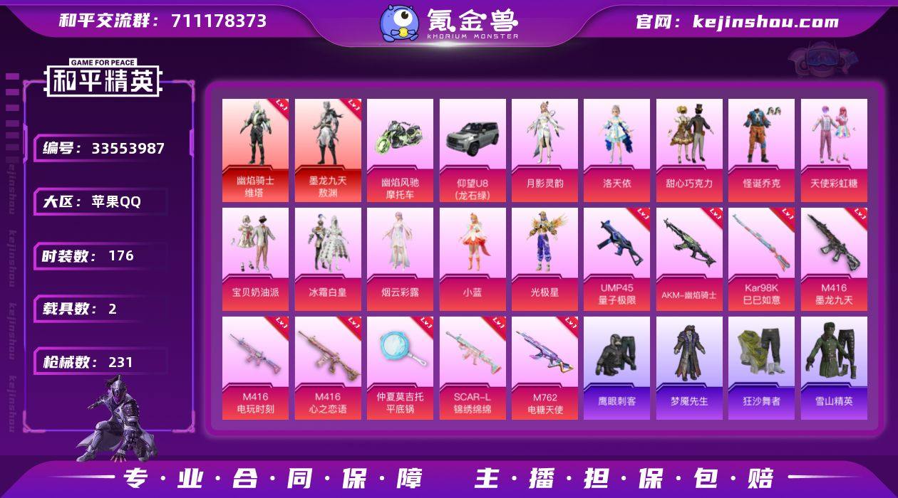YZJ6985-可二次-苹果Q-78563热力值【极品神装身法素材号,AG粉丝logo,2级墨龙九天-敖渊,1级幽焰骑士-维塔,小丑怪诞乔克,甜心三姐妹,洛天依,蓝螳螂,粉螳螂,AG战队服,黑夜传说,奇异狩猎者,狂沙,天命,满级M4心之恋语,幽焰骑士背包,墨龙九天头盔,淘汰盒子*4,改名卡*1】4王牌印记 历史超级王牌12星 169套装 215枪皮 【2载具】 仰望U8(龙石绿) 幽焰风驰摩托车 【2神装】 幽焰骑士-维塔 墨龙九天-敖渊 【2稀有】 奇异狩猎者 浪漫天命 【11粉装】 小蓝 光极星 宝贝奶油派 天使彩虹糖 甜心巧克力 洛天依 烟云彩露 未来歌姬 怪诞乔克 甜蜜誓约 冰霜白皇 【7特效枪】 SCAR-L-锦绣绵绵 (5级) M416-心之恋语 (7级) M416-墨龙九天 (3级) M416-电玩时刻 (5级) AKM-幽焰骑士 (3级) M762-电糖天使 (4级) UMP45-量子极限 (5级) 【7飞行器】幽焰列车飞行器 龙翔九天飞行器 深渊漩涡飞行器 拂晓神骑飞行器 天之羽翼飞行器 水晶纸鸢飞行器 霓虹漫游飞行器【14热门】 8号机 Mark.06 雪山精英 梦魇先生 鹰眼刺客 AG战队服 团圆交子 瑞龙福将 狂沙舞者 漫步者 冰爽海盐 极速红龙 M762-奇异狩猎者 M762-瑞龙福将 【3头盔】 甜心宝贝头盔 百万伏特头盔 心之恋语头盔 【4背包】 折纸暴龙...
