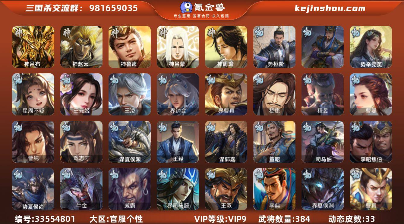 官阶:大将军;VIP等级:VIP9;史诗武将数量:45;动态皮肤数量:33;武将总数:384;史诗宝珠数量:0;将魂数量:4383;神将:3;魏国史诗武将:21;蜀国史诗武将:11;吴国史诗武将:6;群史诗武将:12 神吕布,神赵云,神鲁肃,星周不疑,王元姬,王凌,界钟会,界曹真,嵇康,曹婴,曹纯,戏志才,蒋济,势辛宪英,程昱,势桓阶,关索,谋赵云,诸葛瞻,赵襄,沙摩柯,谯周,傅佥,界黄忠,花鬘,董允,谋关羽,周处,吴景,骆统,界朱然,界徐盛,势太史慈,张琪瑛,星甘宁,苏飞,麹义,庞德公,沮授,界左慈,界李儒,谋张角,许攸,星董卓,兀突骨,神吕蒙,神周瑜,势夏侯尚,SP关羽,SP蔡文姬,乐进,曹昂,诸葛诞,朱灵,文聘,SP姜维,钟会,曹冲,郭淮,满宠,界王异,界曹操,界司马懿,界夏侯惇,界张辽,界许褚,界郭嘉,李典,曹真,韩浩史涣,陈群,曹叡,曹休,钟繇,司马朗,郭皇后,孙资刘放,辛宪英,界甄姬,吕虔,鲁芝,界荀彧,界徐晃,杜畿,界曹丕,界邓艾,张恭,界曹植,界满宠,卞夫人,华歆,蔡贞姬,袁涣,王双,崔琰,毛玠,谋徐晃,谋于禁,谋荀彧,界曹休,牵招,胡班,李昭焦伯,王经,司马伷,文钦,谋郭嘉,谋夏侯渊,牛金,界夏侯渊,臧霸,唐咨,董昭,SP孙尚香,关银屏,夏侯霸,马良,关兴张苞,廖化,界马岱,关平,简雍,刘封,界法正,界关兴张苞,界刘备,界关羽,界张飞,界赵...