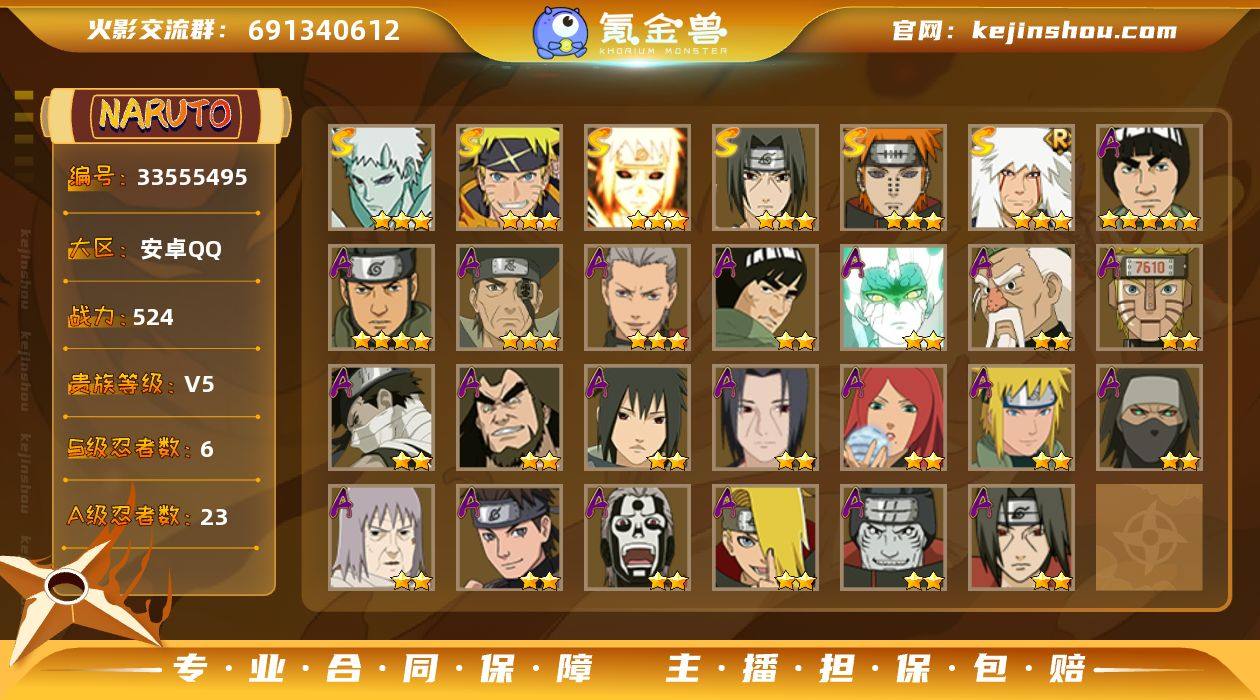 【HYC1851】VIP等级V5/战力524W/S忍数量6/A忍数量23/二星A-大野木「侠隐江湖」/三星S-波风水门「九喇嘛连结」/三星S-宇智波带土「十尾人柱力」/二星A-飞段「死司凭血」/二星A-宇智波鼬/二星A-猿飞日斩「火影继承人」/2星小南「神驹佑将」/三星A-飞段/三星S-佩恩「天道」/三星S-漩涡鸣人·宇智波佐助/五星A-迈特凯/2星旗木卡卡西「神威对决」/二星A-波风水门 「青年」/四星A-猿飞阿斯玛/三星S-自来也「舞之豪杰」/二星A-桃地再不斩「秽土转生」/二星A-角都「晓创生」/二星A-神农 「羁绊」/二星A-不风/二星A-宇智波鼬 「夏日限定」/二星A-宇智波泉奈/二星A-迪达拉/二星A-巳月「仙人模式」/三星A-土台「忍界大战」/二星A-干柿鬼鲛/二星A-迈特凯「青春爆炸」/二星A-机械鸣人「初始形态」/二星A-千代「近松十人卫」/三星S-宇智波鼬 「须佐能乎」