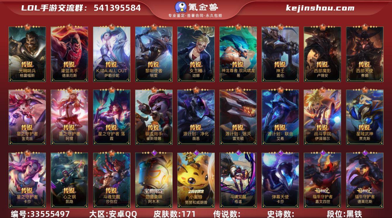 【LSC642】137英雄/171皮肤/璀璨钻石/夜星流火 金克丝/黎明使者 破晓之殇 佛耶戈/神王盖伦/心之钢凯隐/源计划:净化/星之守护者金克丝/星之守护者卡莎/K/DA ALLOUT萨勒芬妮/星之守护者阿狸/星域武神贾克斯/西部魔影卢锡安/驯龙炮手/星之守护者 落/神龙尊者 驭风啸龙/灌篮高手/光明哨兵格雷福斯/女主播风女/源计划:联合/黎明使者锐雯/战斗学院ez/斗魂觉醒 莎弥拉/源计划:泯灭/西部天使赛娜/钢铁军团/腥红之月剑魔/劲道美味 阿木木/黑夜使者凯隐/丧尸努努/小蜜蜂努努和威朗普/地狱行者猴子/腥红之月皎月/无限烈焰/光明哨兵黛安娜/猎龙勇士赵信/蕊雪盈春:晏安 赫卡里姆/末路管家/猛虎布隆/礼物选好了吗? 布隆/西部牛仔/腥红之月烬/弹幕天使/K/DA ALL OUT卡莎/清剿小队潘森/铁血女忍/福牛守护者剑姬/战场之王亚索/灵能特工天使/源计划:雷/战斗学院蕾欧娜/欧米伽小队 魔鬼伞兵/我,羽饰骑士 崔丝塔娜/娜就去看看/小蜜蜂提莫/秘旅探索者龙女/炼狱魔女/斗魂觉醒 格温/源代码青钢影/福牛守护者皇子/泳池派对盲僧/梦境绅探 凯南/破败军团女枪/源计划:燃/海之歌泽丽/心之钢腕豪/心之钢永恩/福牛守护者诺手/灵魂收割者/神龙尊者 苍龙/福牛守护者牛头/暗星墨菲特/银河魔装机神小鱼...