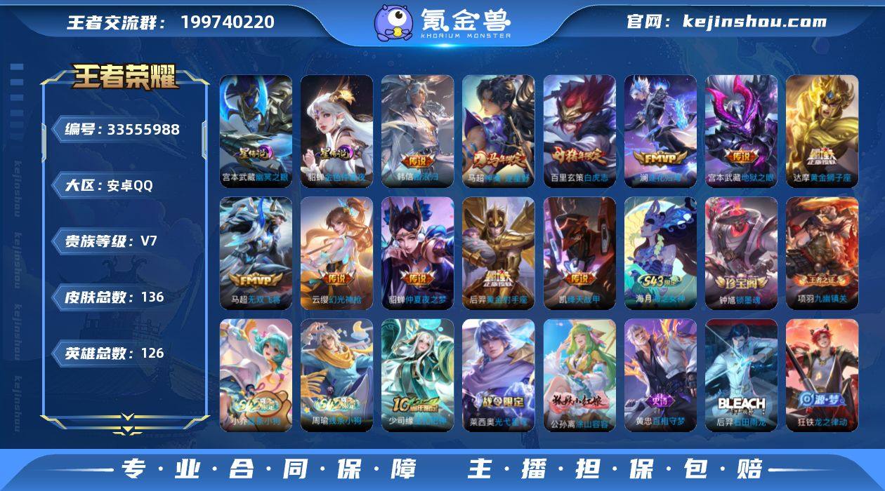 巅峰全能打野号 万战多多 捡漏打野带妹号 安卓Q-V7-至尊星耀III段位-126英雄-136皮肤-11传说-42史诗 【英雄全皮】:孙权全皮,敖隐全皮,空空儿全皮,影全皮 【传说皮肤】:韩信踏浪归,马超神骥逐星野,云缨幻光神枪,澜逐花归海,马超无双飞将,铠绛天战甲,达摩黄金狮子座,百里玄策白虎志,后羿黄金射手座,貂蝉仲夏夜之梦,宫本武藏地狱之眼 【限定皮肤】:狄仁杰阴阳师,赵云皇家上将,妲己时之彼端,元歌无心,马可波罗暗影游猎,马可波罗山海玄木吟,狄仁杰魔术师,项羽海滩派对,关羽冰锋战神,孙悟空至尊宝,百里玄策白虎志,百里玄策原初追逐者,裴擒虎李小龙,沈梦溪龙舞盛年,周瑜熔金海岸 【年限皮肤】:百里玄策白虎志,马可波罗山海玄木吟 【赛季限定】:东皇太一噬灭天穹,太乙真人谧流熔炉,钟馗虚灵犬护,甄姬逆浪荇歌,亚瑟荣光之誓,百里玄策原初追逐者,项羽九幽镇关 【战令限定】:马可波罗暗影游猎,孙膑茶境仙,马超访茗客,莱西奥光弋星穹,明世隐往忆晖光,周瑜线条小狗,小乔线条小狗 【史诗皮肤】:海月海之女神,钟馗锁墨魂,周瑜线条小狗,小乔线条小狗,项羽九幽镇关,少司缘巫礼祀神,莱西奥光弋星穹,公孙离涂山容容,黄忠百相守梦,后羿石...