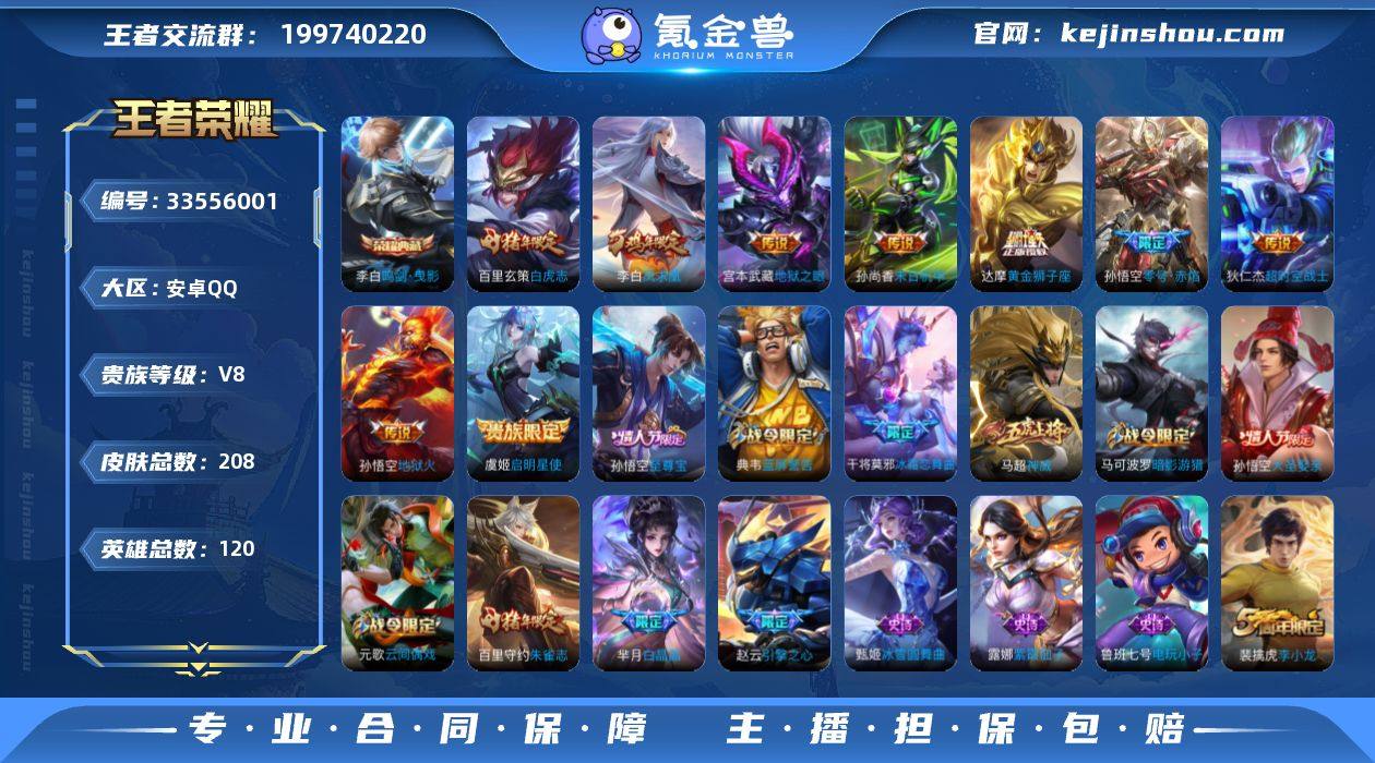 实名: 可修改 性别: 男号 贵族等级: V8 英雄数: 120 皮肤数: 208 荣耀水晶: 鸣剑·曳影 传说皮: 黄金狮子座,末日机甲-孙尚香,地狱火,零号·赤焰,地狱之眼,超时空战士-狄仁杰 限定皮: 李小龙,梁祝,引擎之心,白晶晶,神威,逐梦之音,冰霜恋舞曲,逐梦之影,凤求凰,白虎志,朱雀志,至尊宝,大圣娶亲,霸王别姬-虞姬,五谷丰年 亮点: 【优质装备】:鸣剑·曳影,黄金狮子座,末日机甲-孙尚香(绿蚂蚱),地狱火,零号·赤焰,地狱之眼,超时空战士-狄仁杰