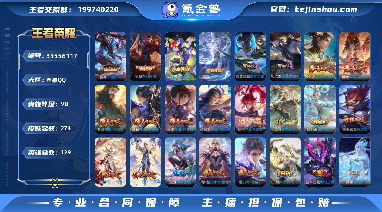 捡漏打野对抗号 王者印记数量12+按键数量18+星传说数量2+铭文150级 苹果Q-V8-最强王者段位-129英雄-274皮肤-2典藏皮肤-2珍品传说-31传说-86史诗 【英雄全皮】:孙权全皮,敖隐全皮,司空震全皮,影全皮 【荣耀典藏】:关羽赤影疾锋,吕布千魇归渊 【珍品传说】:嫦娥器灵落星盏,孙策时之奇旅 【传说皮肤】:云缨神骥越千峰,关羽神骥镇沧海,朵莉亚神骥鸣幻洲,狄仁杰神骥赴朔漠,貂蝉神骥聚万邦,马超神骥逐星野,花木兰异界灵契,后羿神树通天,公孙离云诺千山,司空震愿照山河定,澜愿照九州拓,云缨幻光神枪,桑启鸣野蒿,亚连落雪白狼,典韦战鼓燎原,露娜霜月吟,曜山海苍雷引,李信山海炽霜斩,吕布怒海麟威,百里守约碎云,马超无双飞将,铠绛天战甲,镜炽阳神光,虞姬启明星使,刘备时之恋人,干将莫邪久胜战神,百里玄策白虎志,梦奇胖达荣荣,宫本武藏地狱之眼,孙悟空地狱火,狄仁杰超时空战士 【限定皮肤】:蔡文姬夏日便利店,虞姬夏日便利店,姜子牙天穹之誓,狄仁杰阴阳师,赵云皇家上将,元歌无心,马可波罗暗影游猎,马可波罗山海玄木吟,狄仁杰魔术师,达摩沙漠行僧,项羽海滩派对,关羽百相守梦,程咬金演武夺筹,兰陵王金庭之子,孙悟空至尊宝,孙悟空...